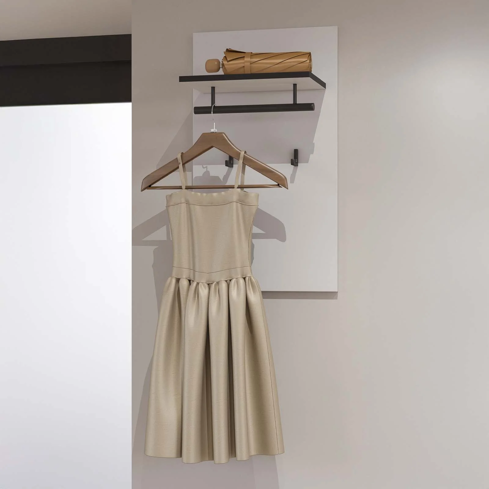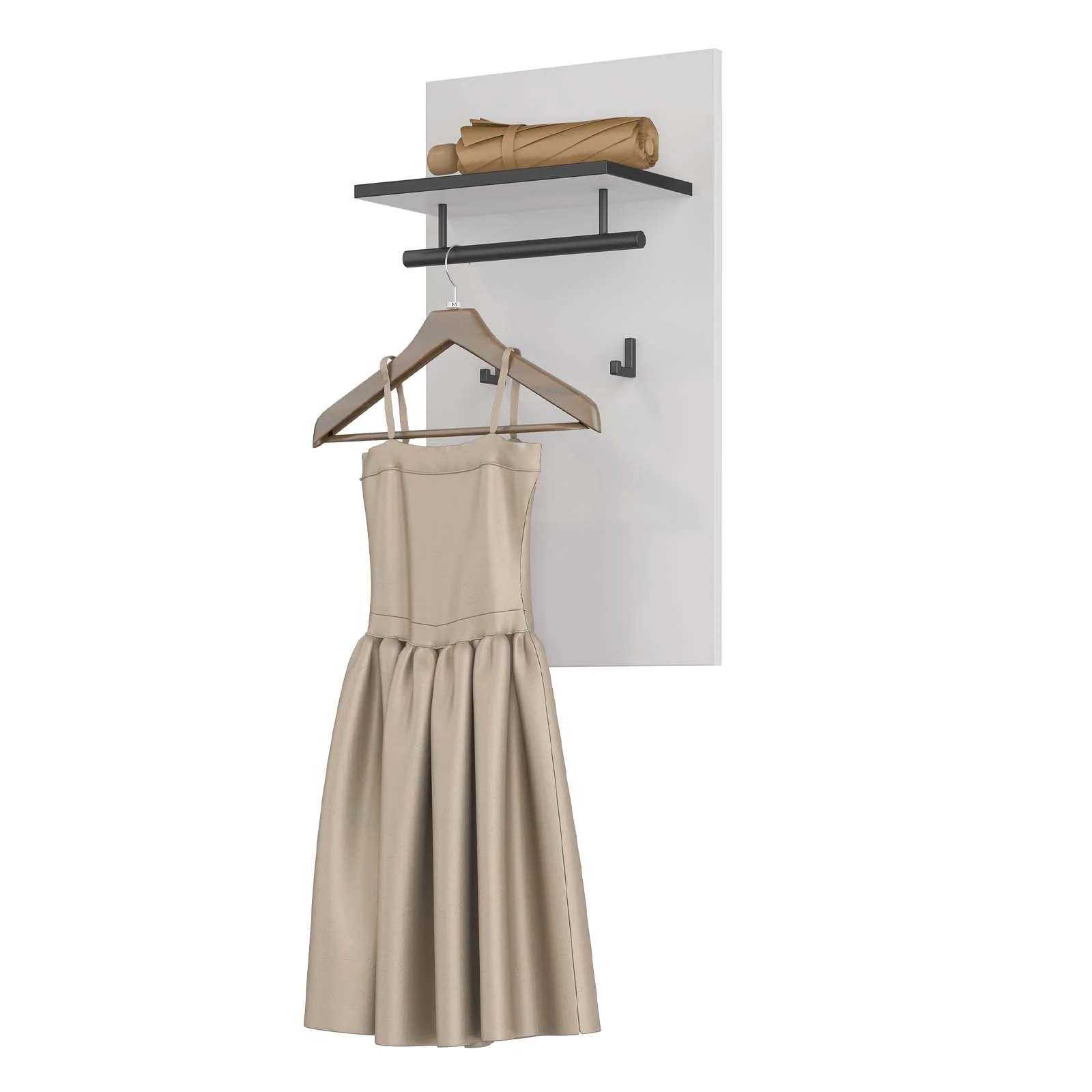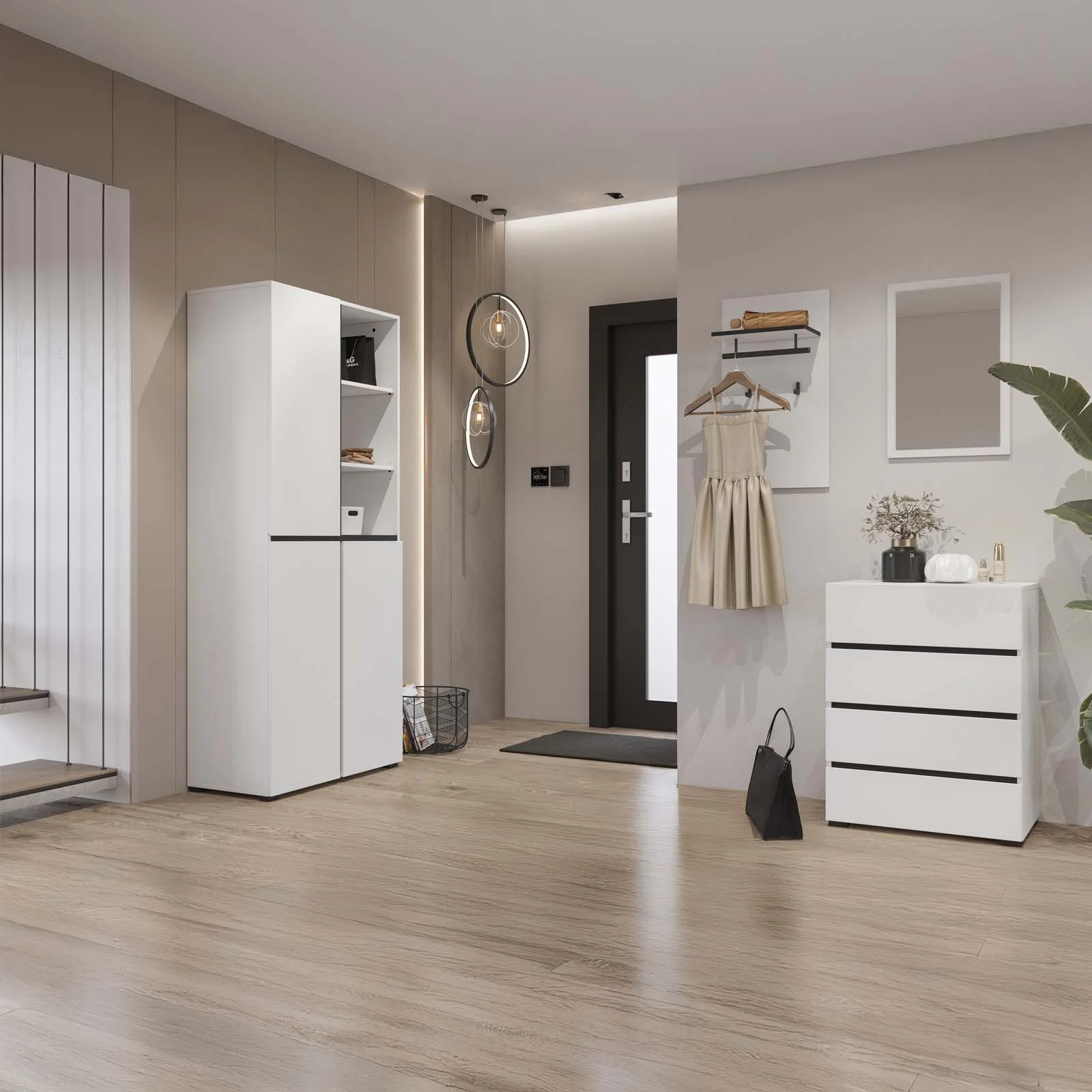 La mensola superiore integrata permette inoltre di riporre con ordine cappelli, sciarpe o piccoli accessori. La finitura bianco opaco, valorizzata dai dettagli interni in nero distintivi della collezione, aggiunge luminosità e raffinatezza, perfetta per ambienti moderni e ariosi.
