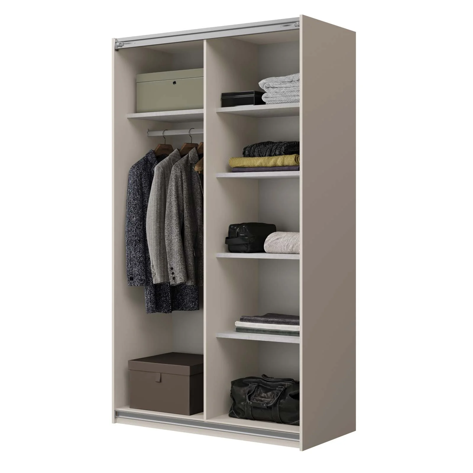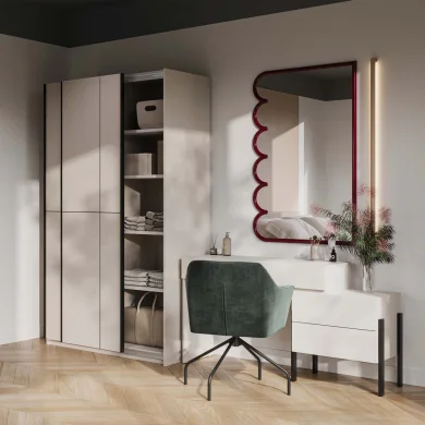 All’interno, la struttura offre un’organizzazione impeccabile grazie ai 9 vani e 6 ripiani, ideali per riporre abiti, biancheria e accessori in modo funzionale e ordinato. La finitura bige cashmere illumina la stanza e regala un’atmosfera calda e accogliente.