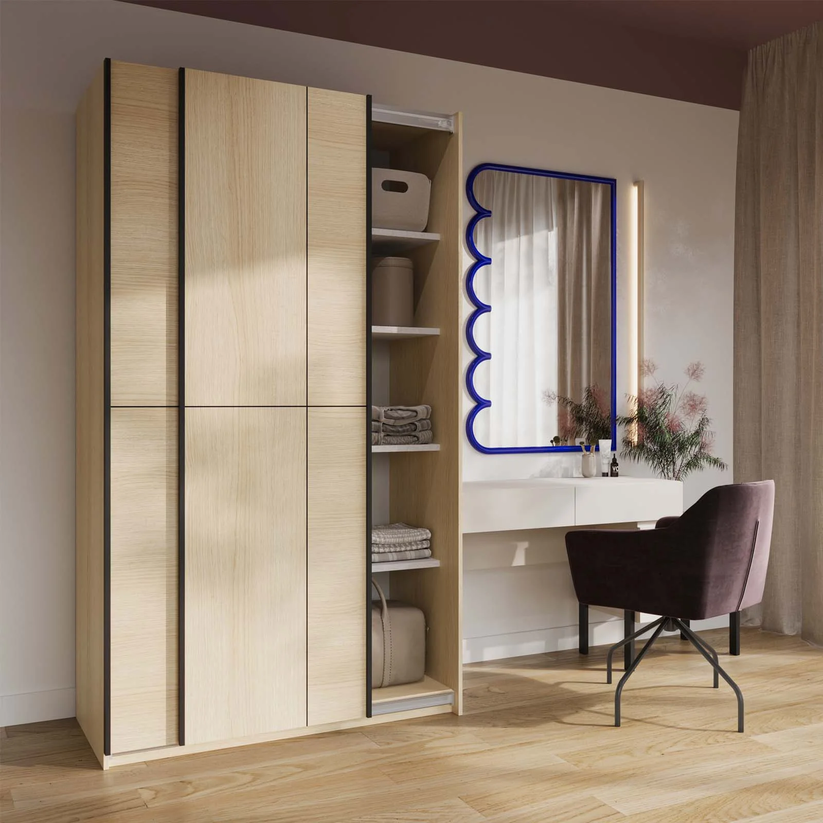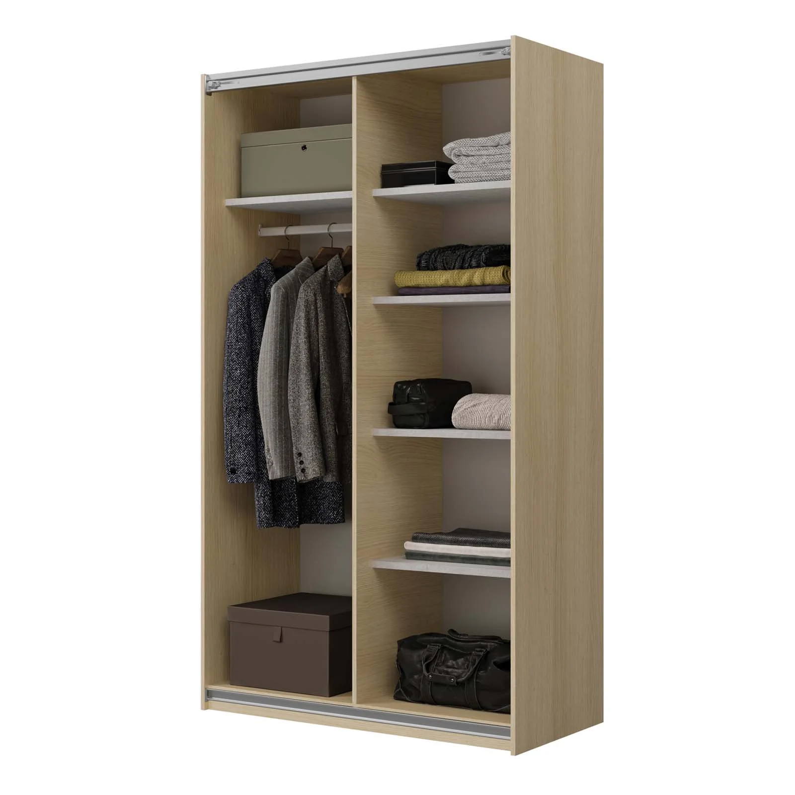 All’interno, la struttura offre un’organizzazione impeccabile grazie ai 7 vani e 5 ripiani, ideali per riporre abiti, biancheria e accessori in modo funzionale e ordinato. La finitura rovere illumina la stanza e regala un’atmosfera calda e accogliente.