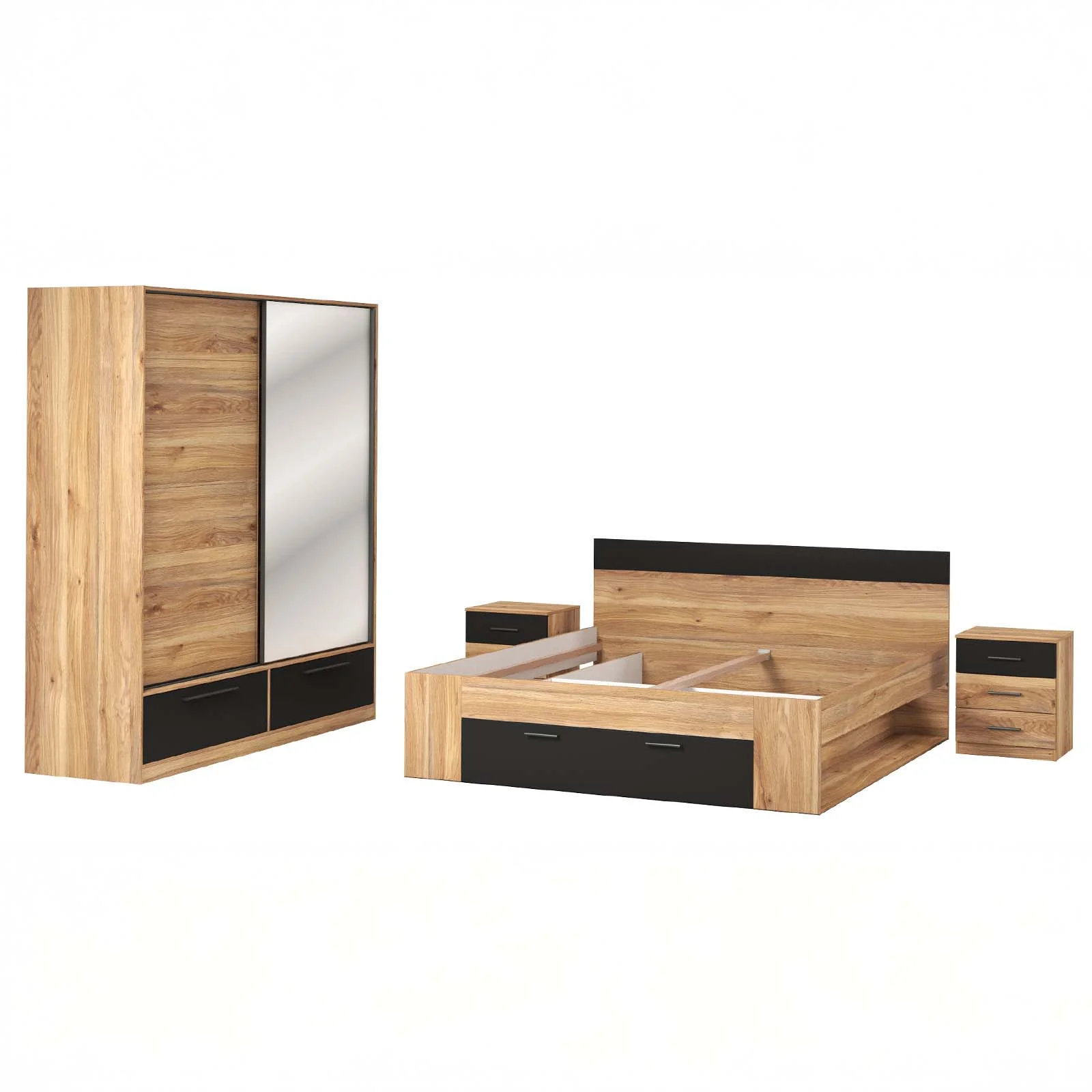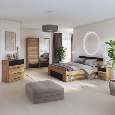 Il raffinato contrasto tra rovere naturale e nero opaco dona alla camera un carattere sofisticato e contemporaneo, perfetto per valorizzare qualsiasi ambiente notte.