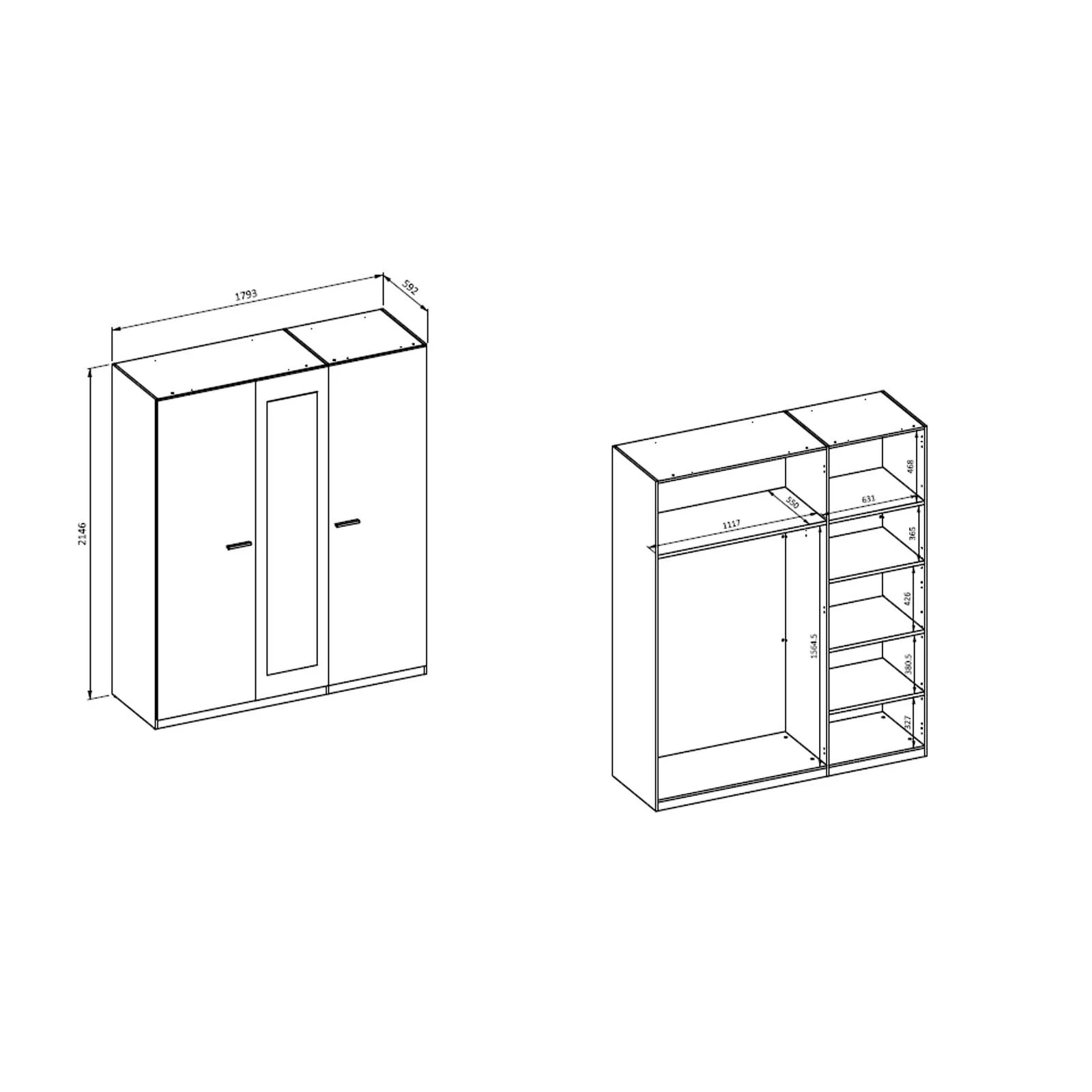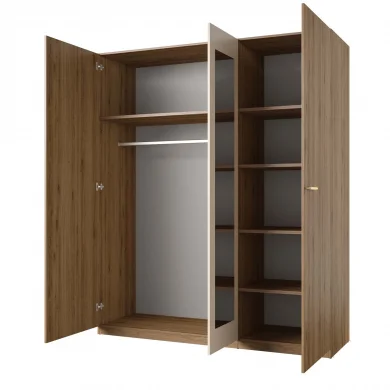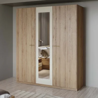 Con le sue 3 ante a battente, di cui una con specchio integrato, questo armadio regala luminosità e ampiezza visiva all’ambiente, oltre a una capienza ottimale. I 7 vani interni e l’asta appendiabiti inclusa offrono spazio ben organizzato per vestiti, accessori e biancheria.