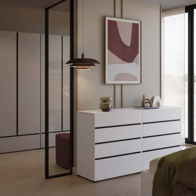 L’armadio della collezione Lolla è il protagonista perfetto per una camera da letto ordinata e raffinata. Con le sue 4 ante battenti e i 2 cassetti inferiori, offre una suddivisione interna studiata per garantire la massima praticità: i 4 vani interni permettono di organizzare abiti e accessori in modo impeccabile, mentre l’asta appendiabiti inclusa assicura uno spazio ideale per cappotti, camicie e vestiti lunghi.