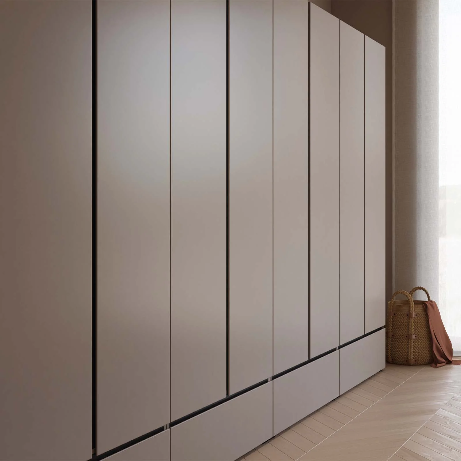 La finitura tortora regala un’atmosfera calda, accogliente e senza tempo, capace di adattarsi con eleganza a diverse palette di colori e stili d’arredo. I dettagli interni in nero, tipici della collezione, aggiungono un raffinato contrasto contemporaneo.