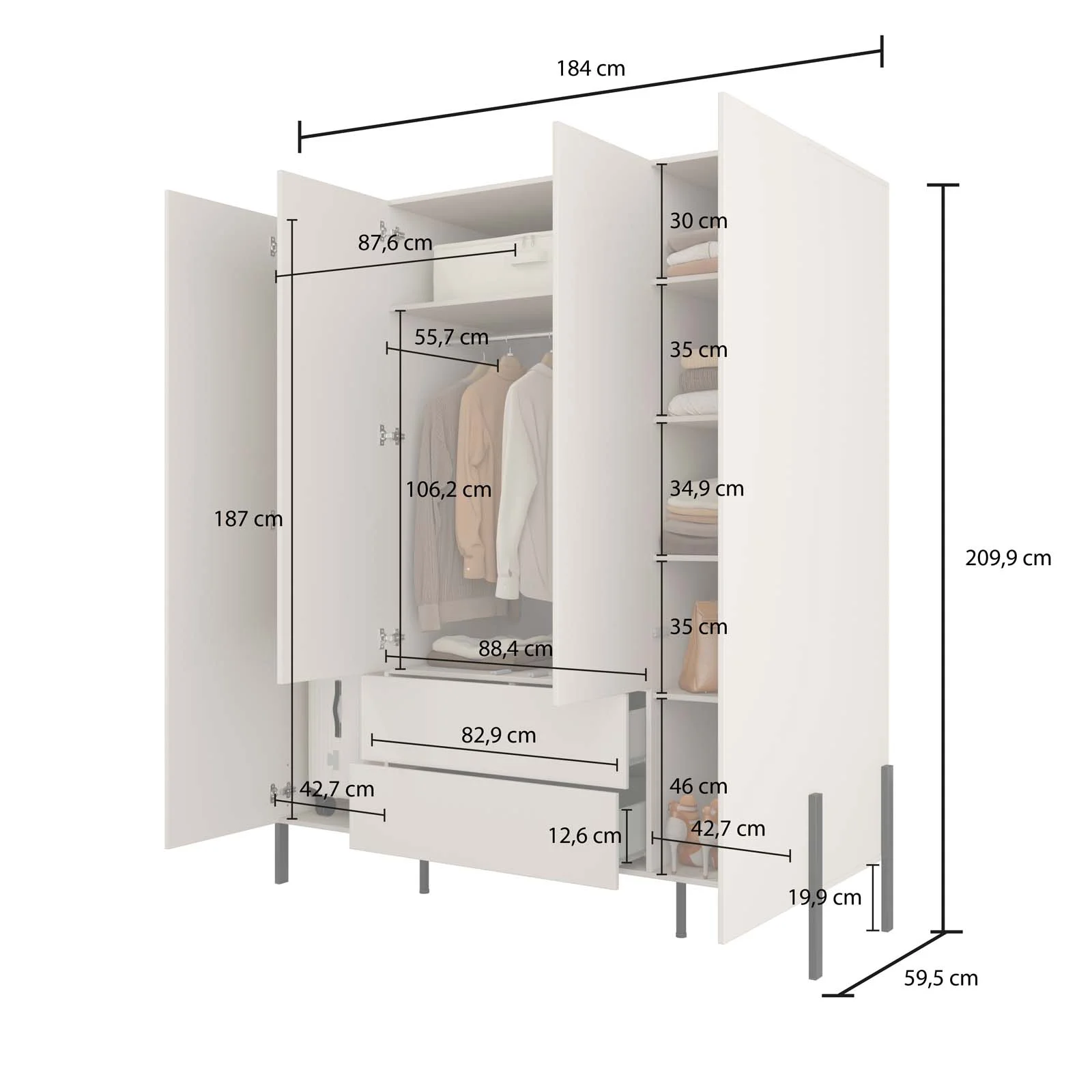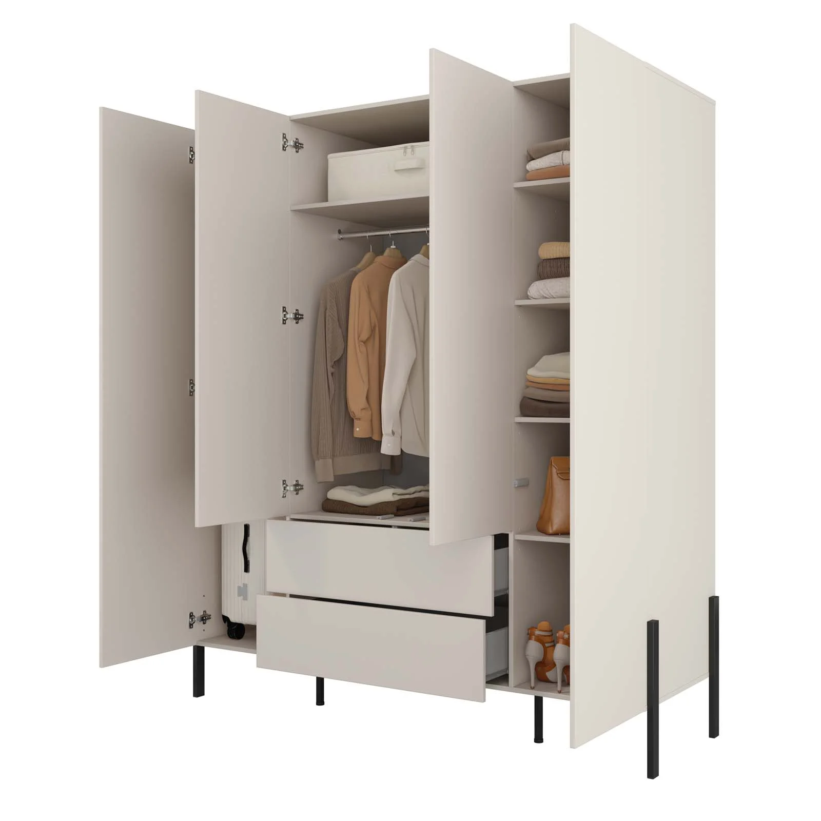La struttura prevede 4 ante e 2 cassetti, studiati per offrire uno spazio interno versatile e ben organizzato: un comodo vano guardaroba con asta appendiabiti inclusa, una sezione con ripiani interni perfetti per la biancheria e gli accessori, e due ampi cassetti per avere sempre tutto a portata di mano.