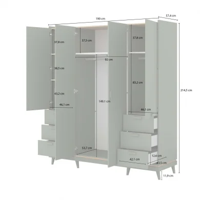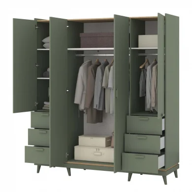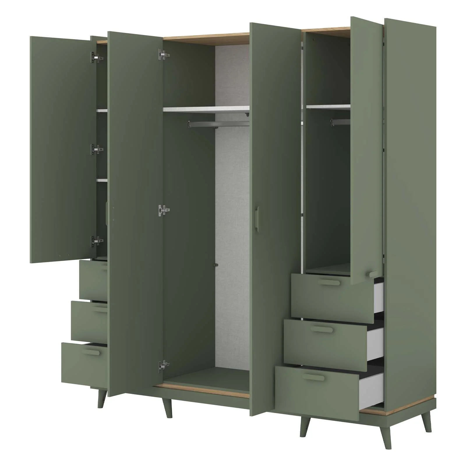 L’armadio è dotato di 4 ante battenti che celano 7 vani interni ben organizzati e 4 ripiani, perfetti per riporre abiti, accessori e biancheria. Nella parte inferiore, i 6 cassetti scorrevoli offrono ulteriore spazio contenitivo, ideale per capi piegati e oggetti di uso quotidiano.