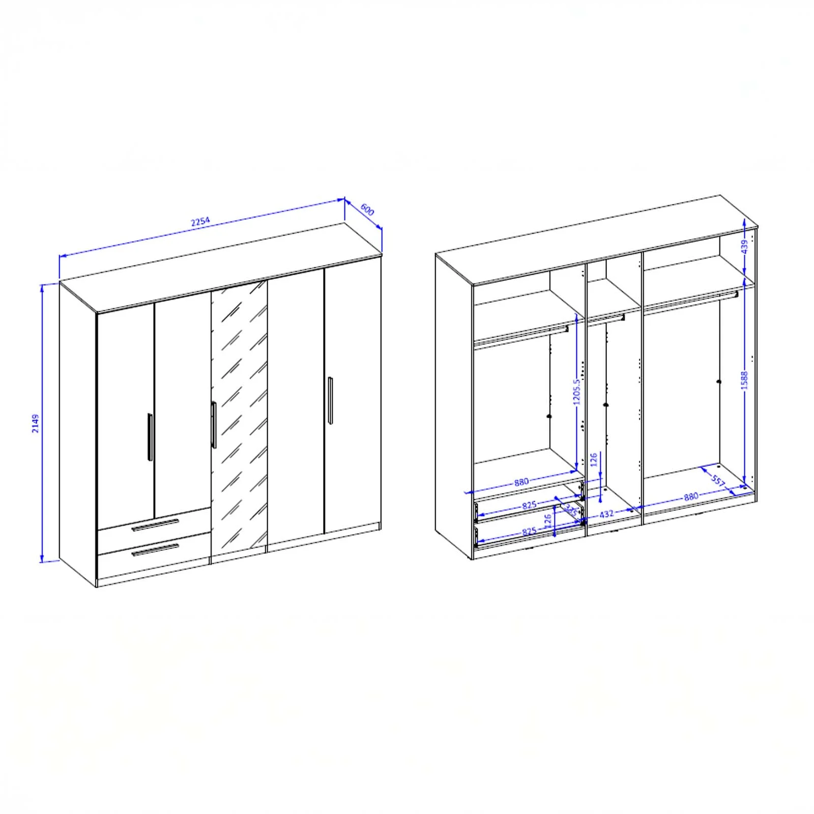 Con le sue 5 ante a battente, di cui una con specchio integrato, e i 2 cassetti capienti, offre la massima praticità per riporre abiti, accessori e biancheria. All’interno, i 6 vani ben suddivisi e le aste appendiabiti metalliche incluse garantiscono un’organizzazione impeccabile.