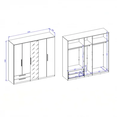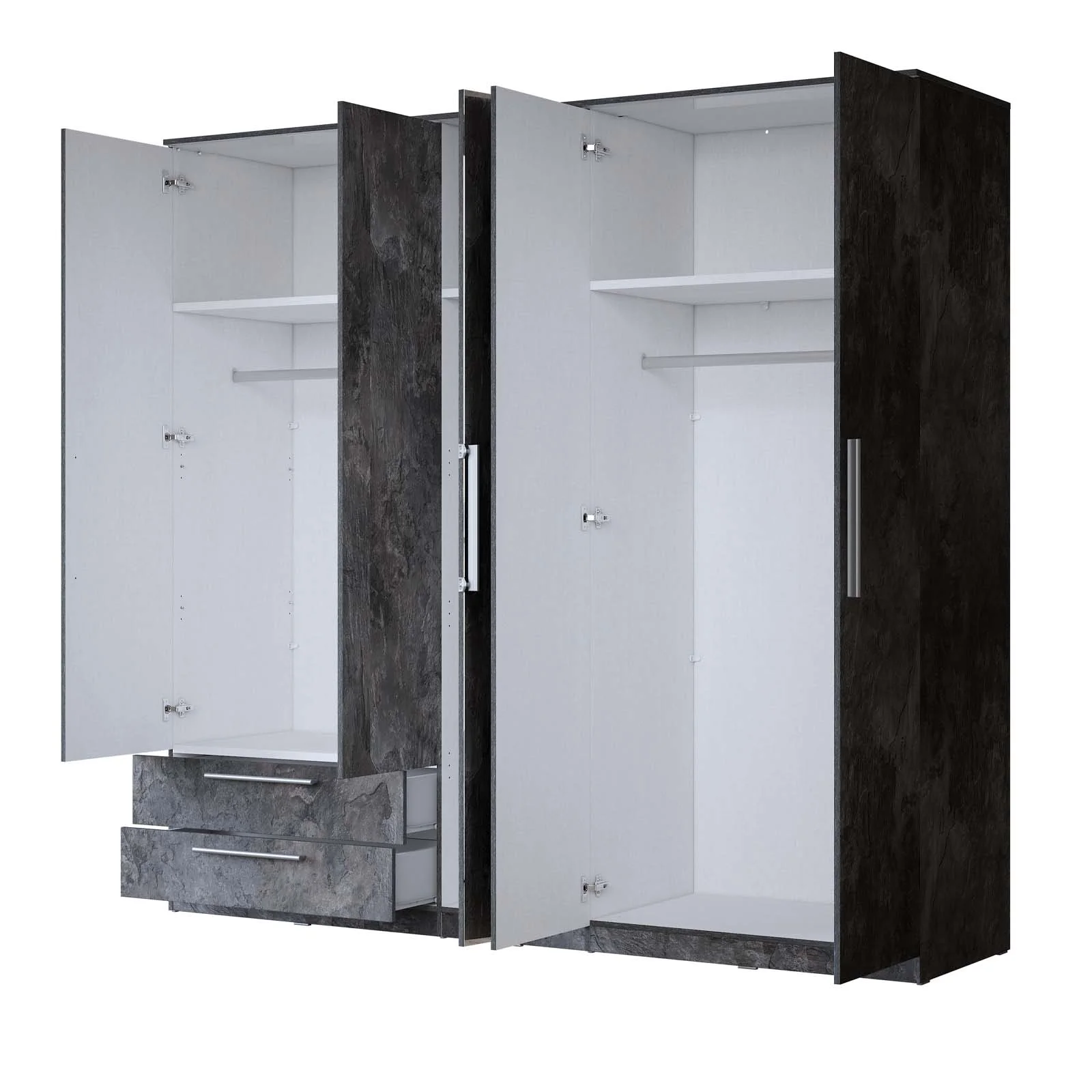 Dotato di 5 ante a battente, di cui una con specchio integrato, e di 2 pratici cassetti, offre la combinazione ideale di capienza e ordine. All’interno troverai 6 vani ben organizzati e aste appendiabiti metalliche, perfetti per accogliere abiti, giacche e accessori in modo ordinato.