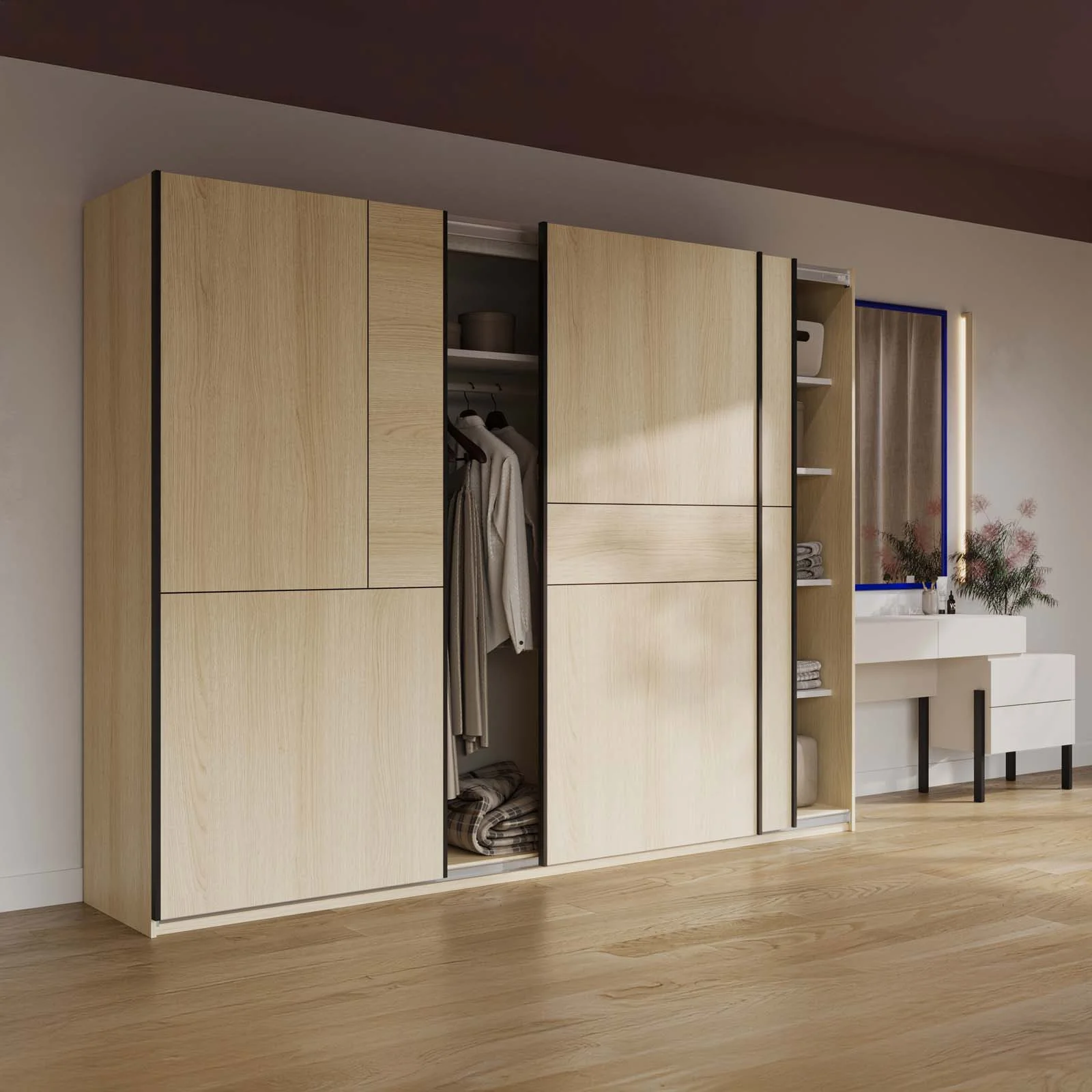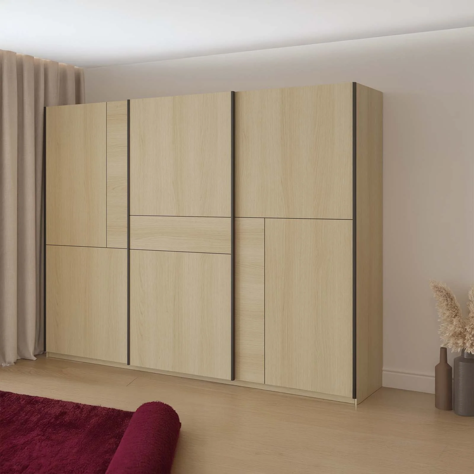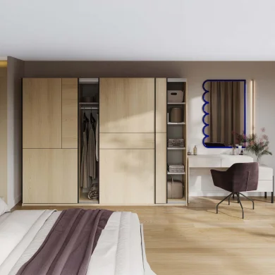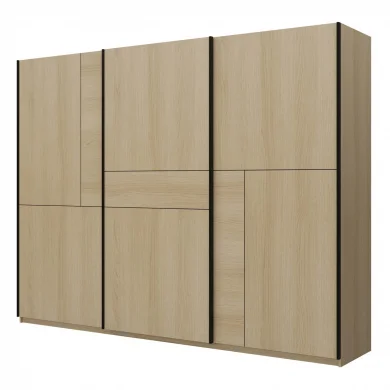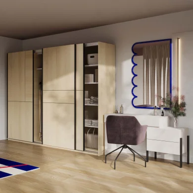 Le sue linee essenziali e l'incastro dei suoi pannelli sulle ante danno origine a caratteristici disegni geometrici, lo rendono un pezzo unico, capace di conferire personalità e carattere all’ambiente. Le ante scorrevoli, pratiche e salvaspazio, ottimizzano l’organizzazione anche nelle stanze più compatte senza rinunciare al comfort d’uso.