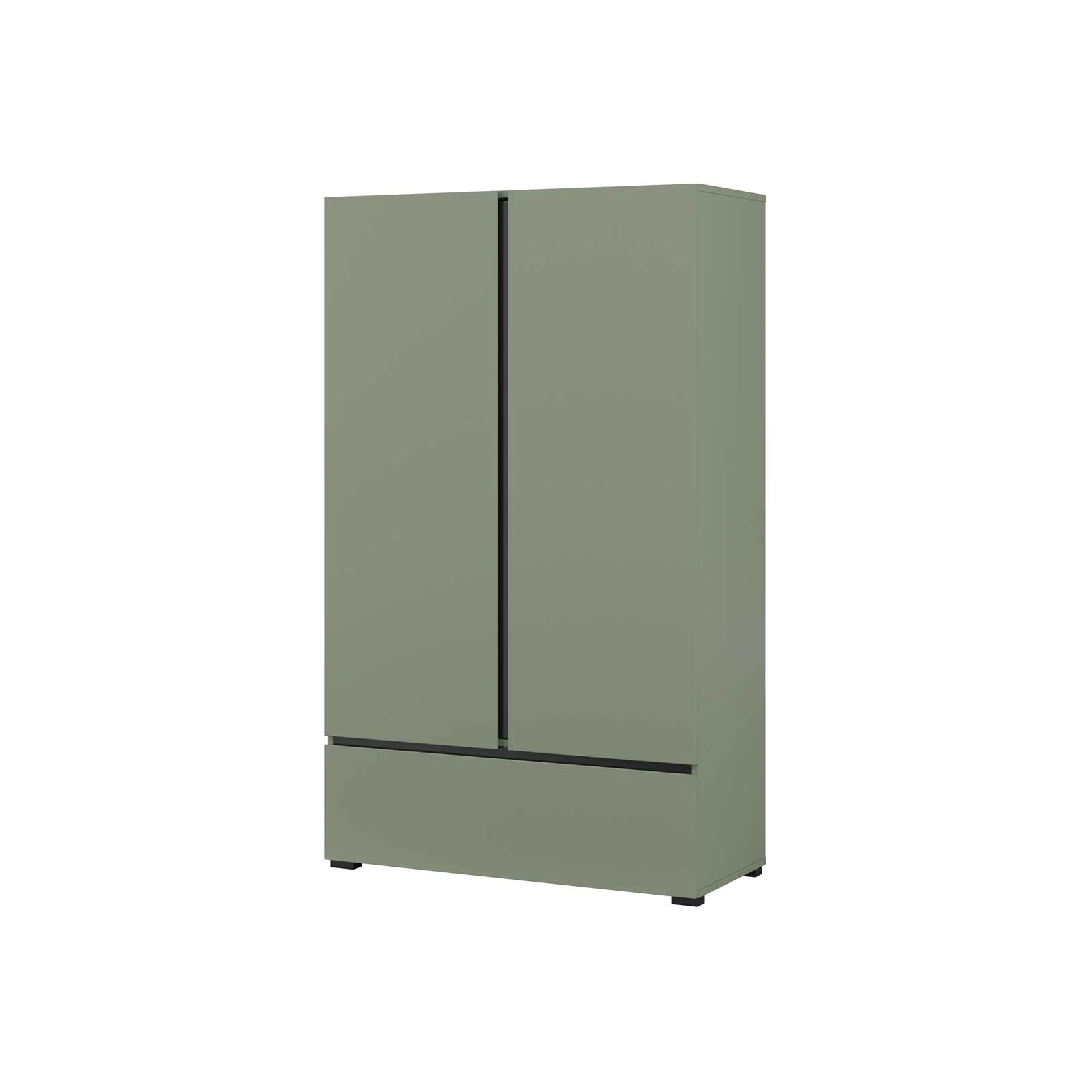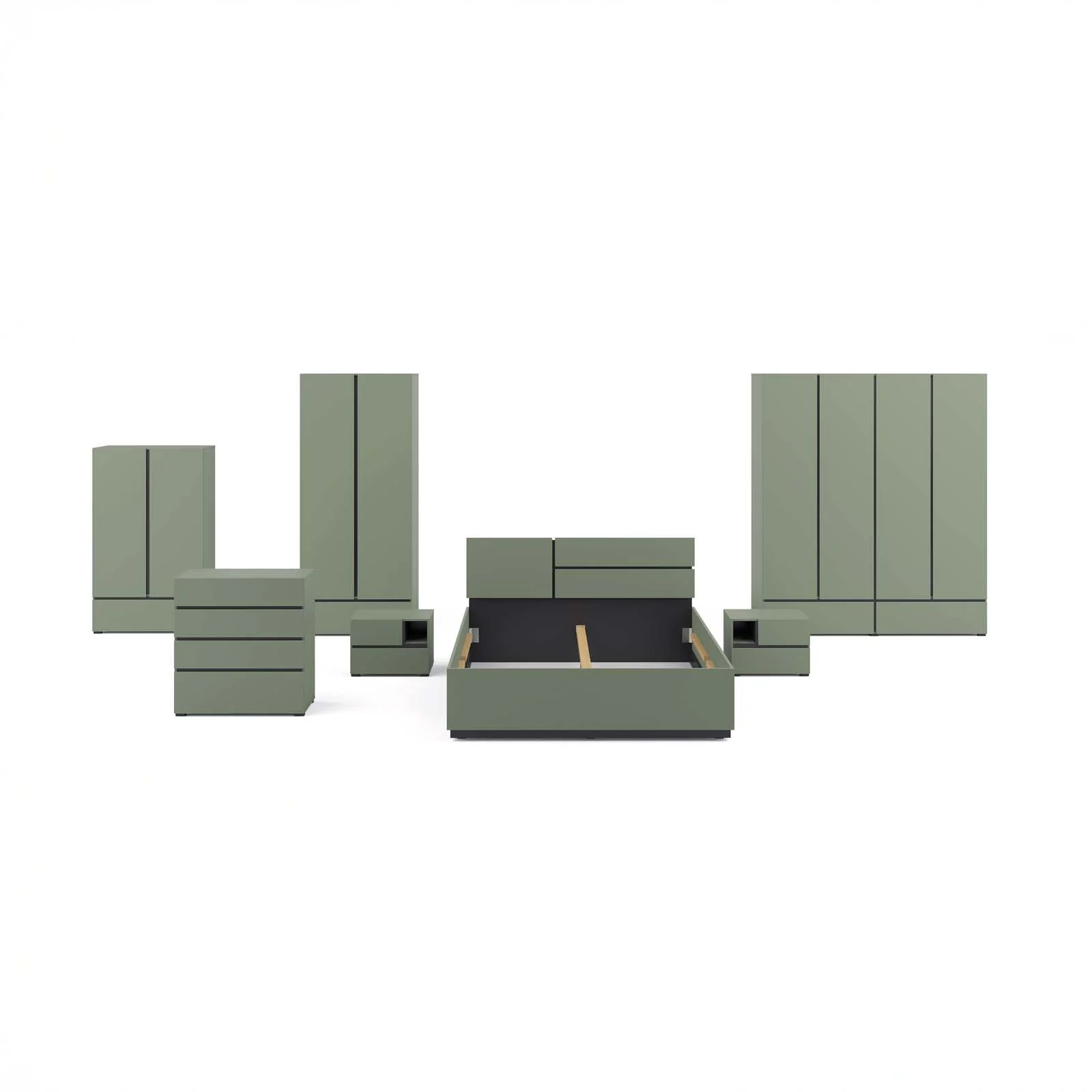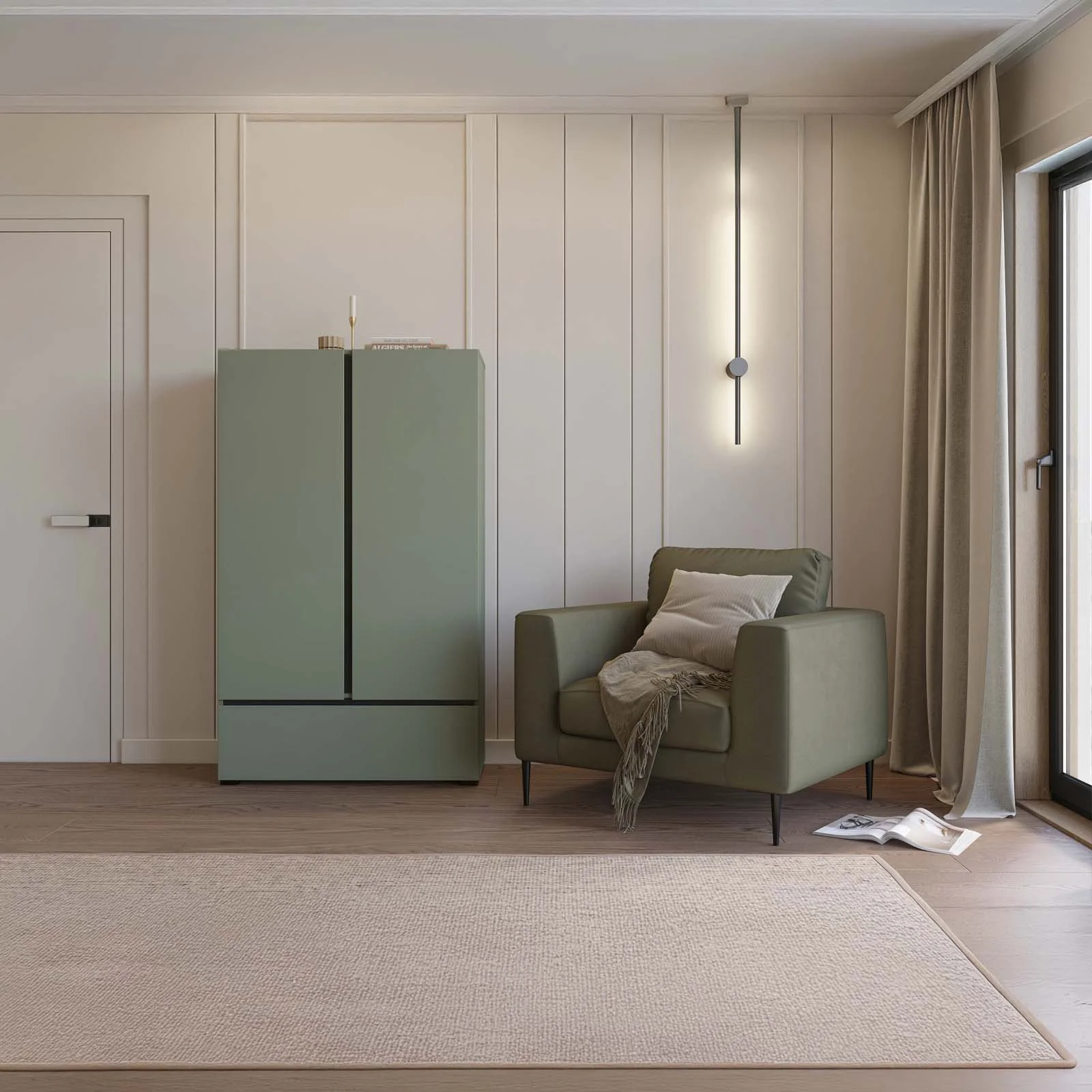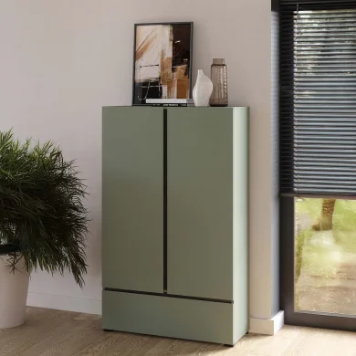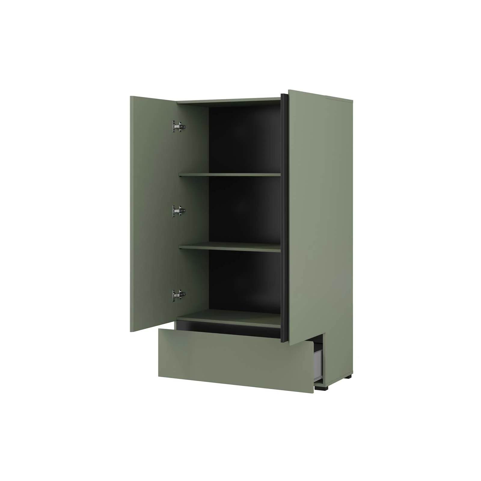 La finitura verde opaca, abbinata ai dettagli in nero a contrasto, conferisce al mobile un aspetto moderno e armonico, capace di donare freschezza e personalità a qualsiasi ambiente.
