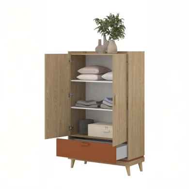 All’interno delle 2 ante a battente trovano posto 3 vani capienti, ideali per riporre indumenti, biancheria o accessori, mentre il cassetto scorrevole posto nella parte inferiore è perfetto per oggetti di uso quotidiano.