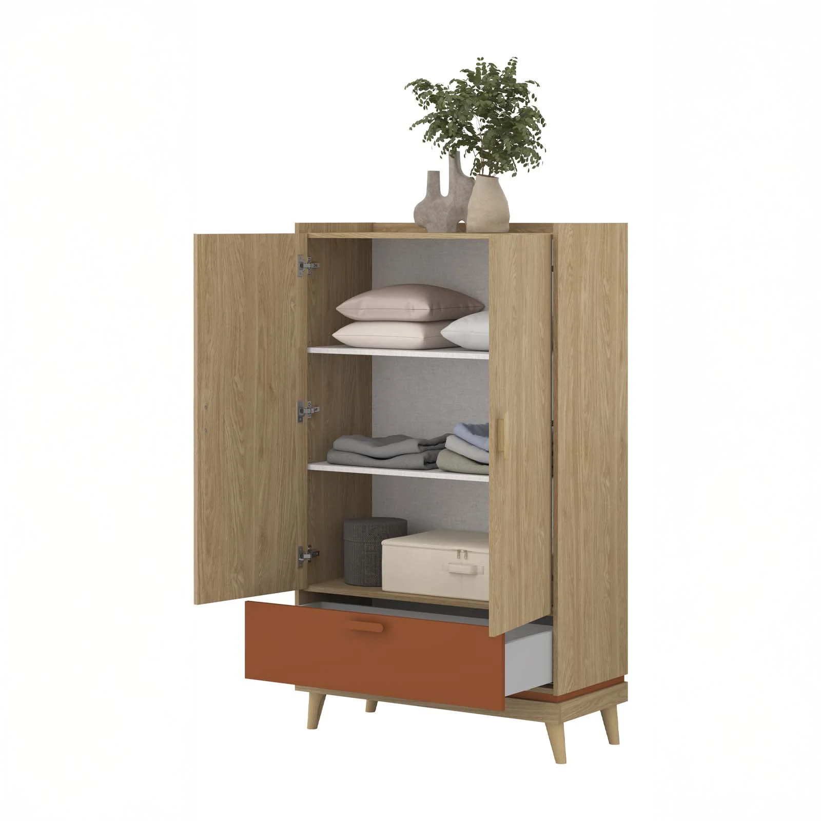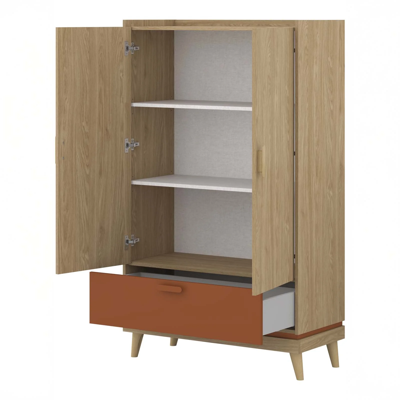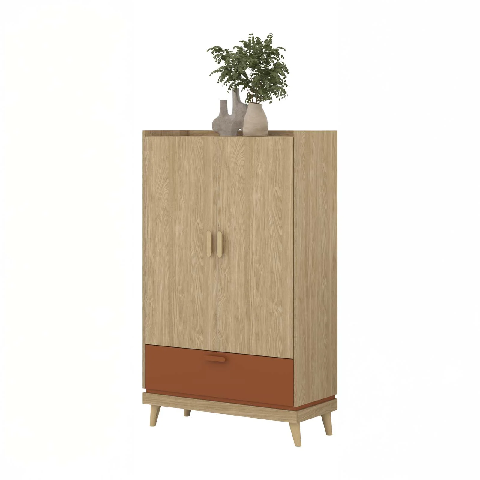 La finitura in rovere, impreziosita dai dettagli in rosso mattone, regala carattere e personalità al prodotto, trasformandolo in un elemento d’arredo che coniuga funzionalità e stile nordico.