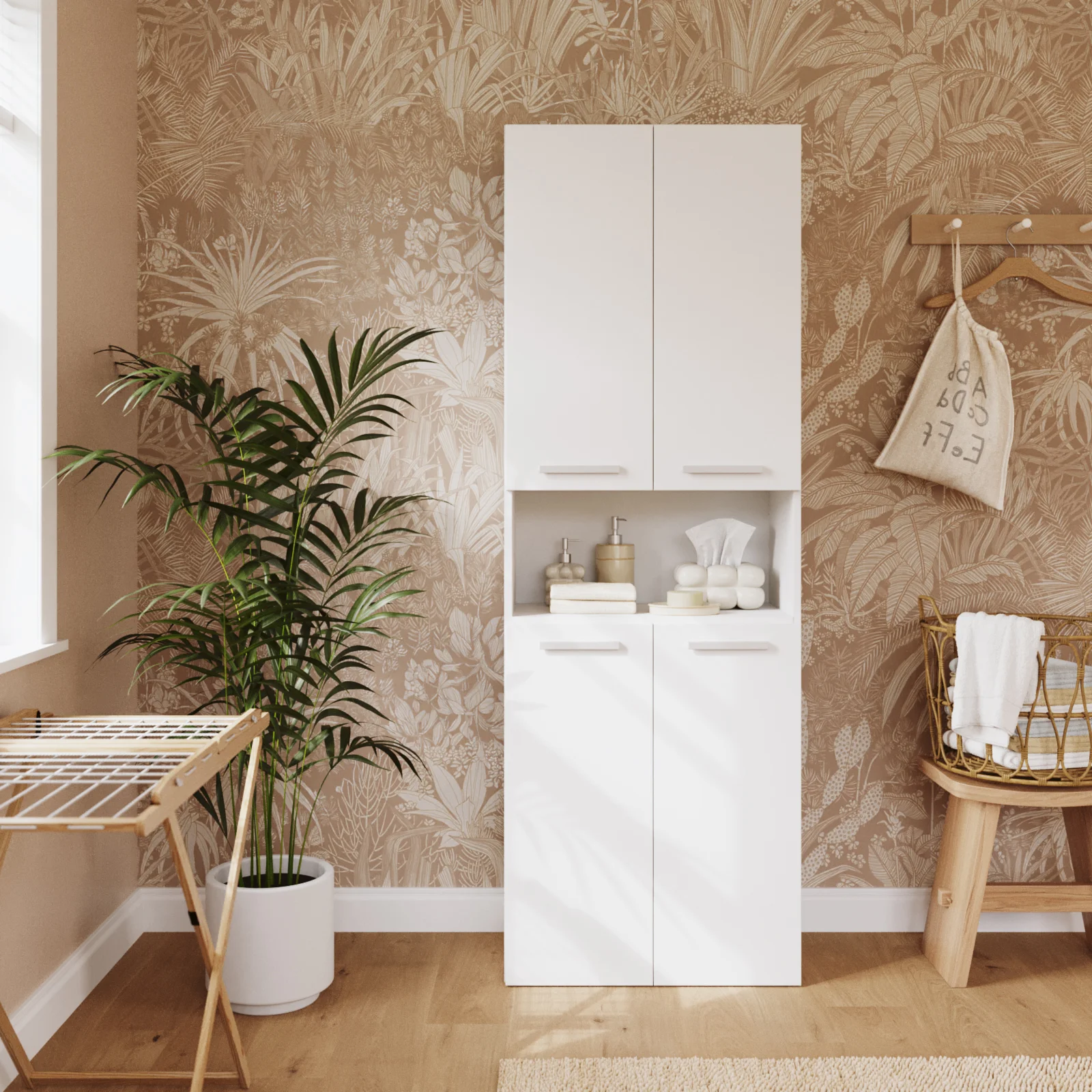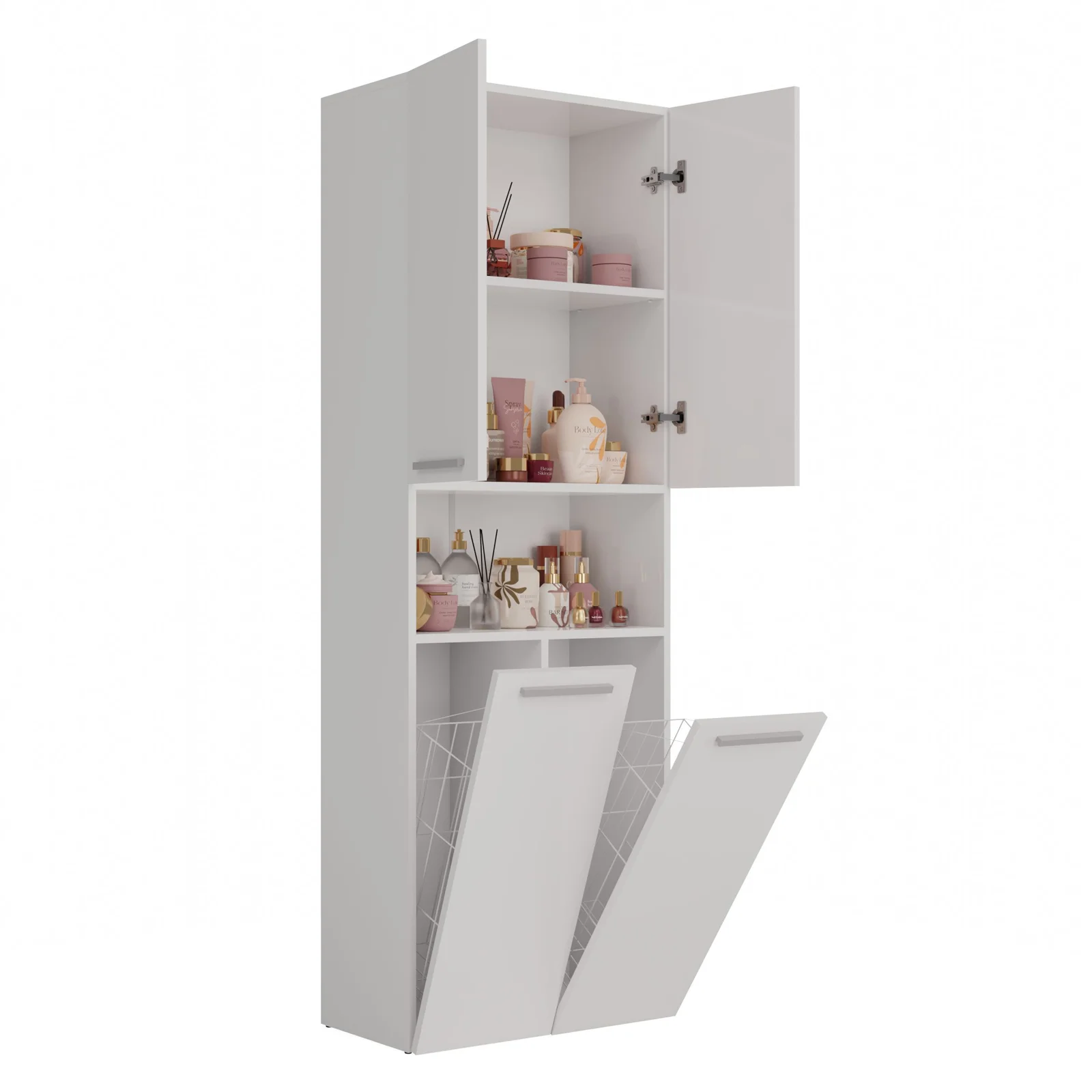 All’interno, il mobile offre 2 vani chiusi con 1 ripiano interno e 1 vano a giorno con 1 ripiano a vista, perfetti per riporre o esporre oggetti di uso frequente. I 2 capienti cesti porta-biancheria integrati completano il mobile, rendendolo una soluzione completa per gestire con stile e praticità lo spazio dedicato al bucato.