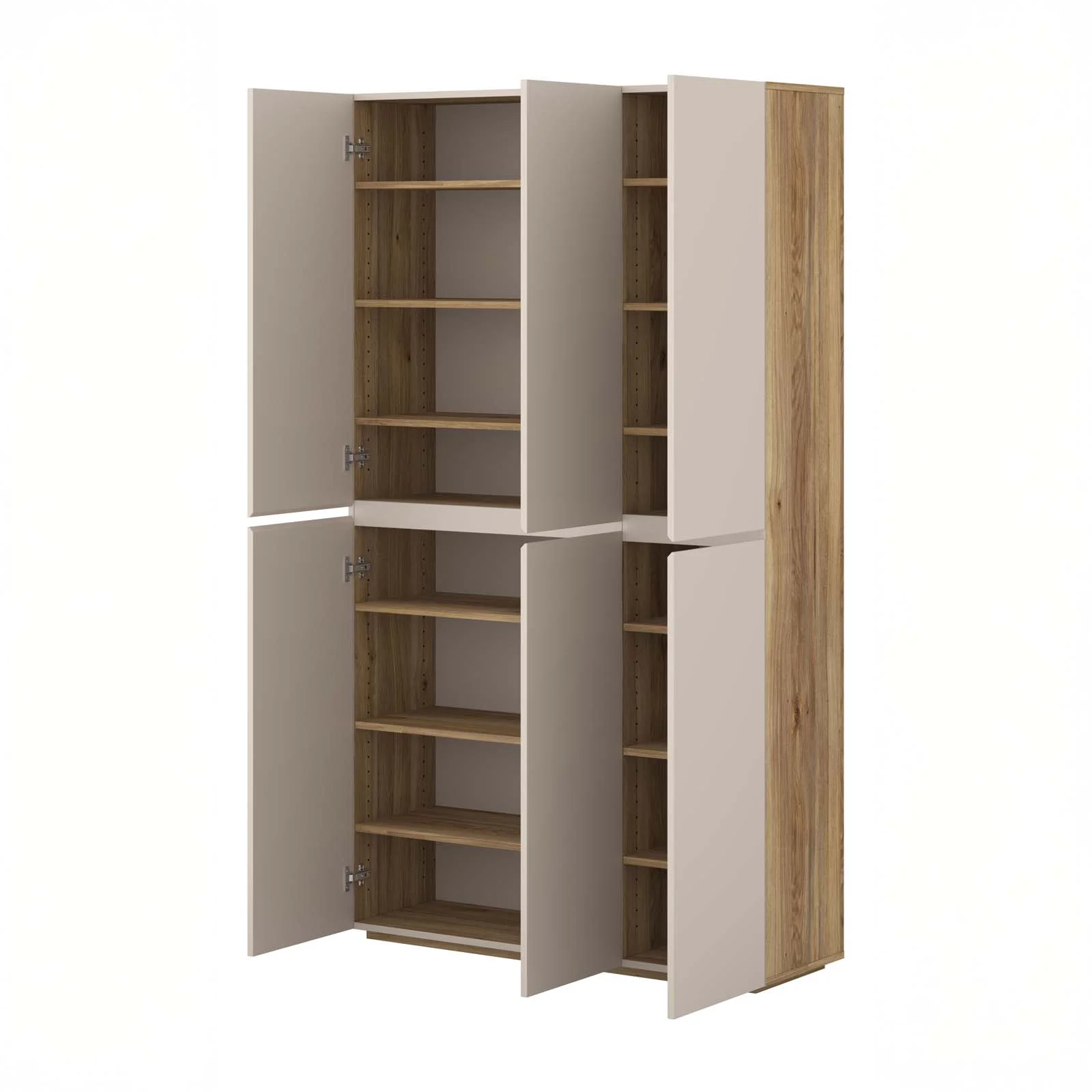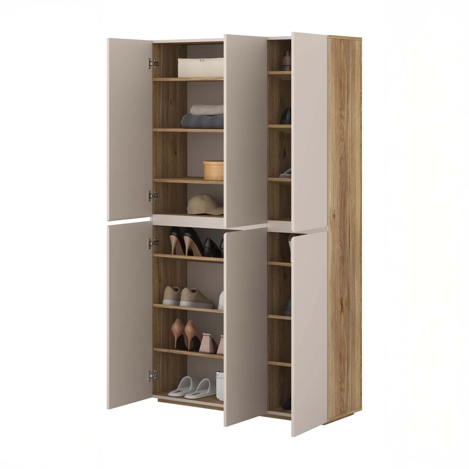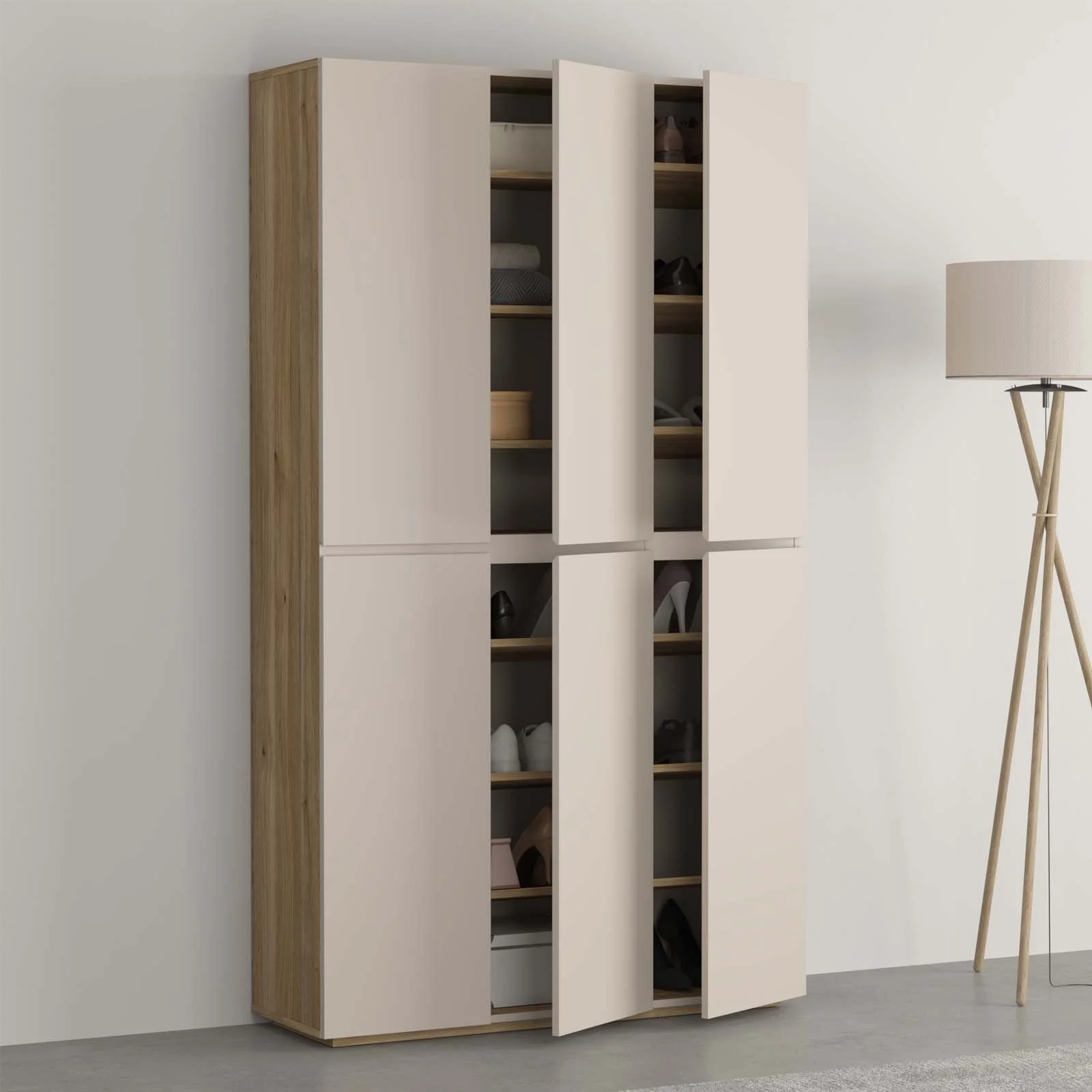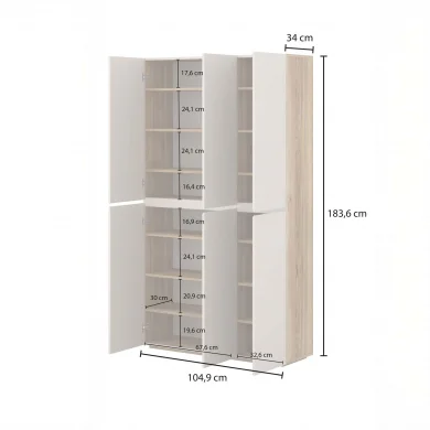 Dotata di 6 ante a battente e di una struttura interna studiata per sfruttare ogni centimetro, offre 16 vani e 14 ripiani regolati alla perfezione per ospitare sneakers, décolleté, stivaletti, ma anche borse, scatole, detergenti o biancheria piegata. Una vera alleata del tuo ordine quotidiano, ideale in ingresso, camera, lavanderia o cabina armadio.
