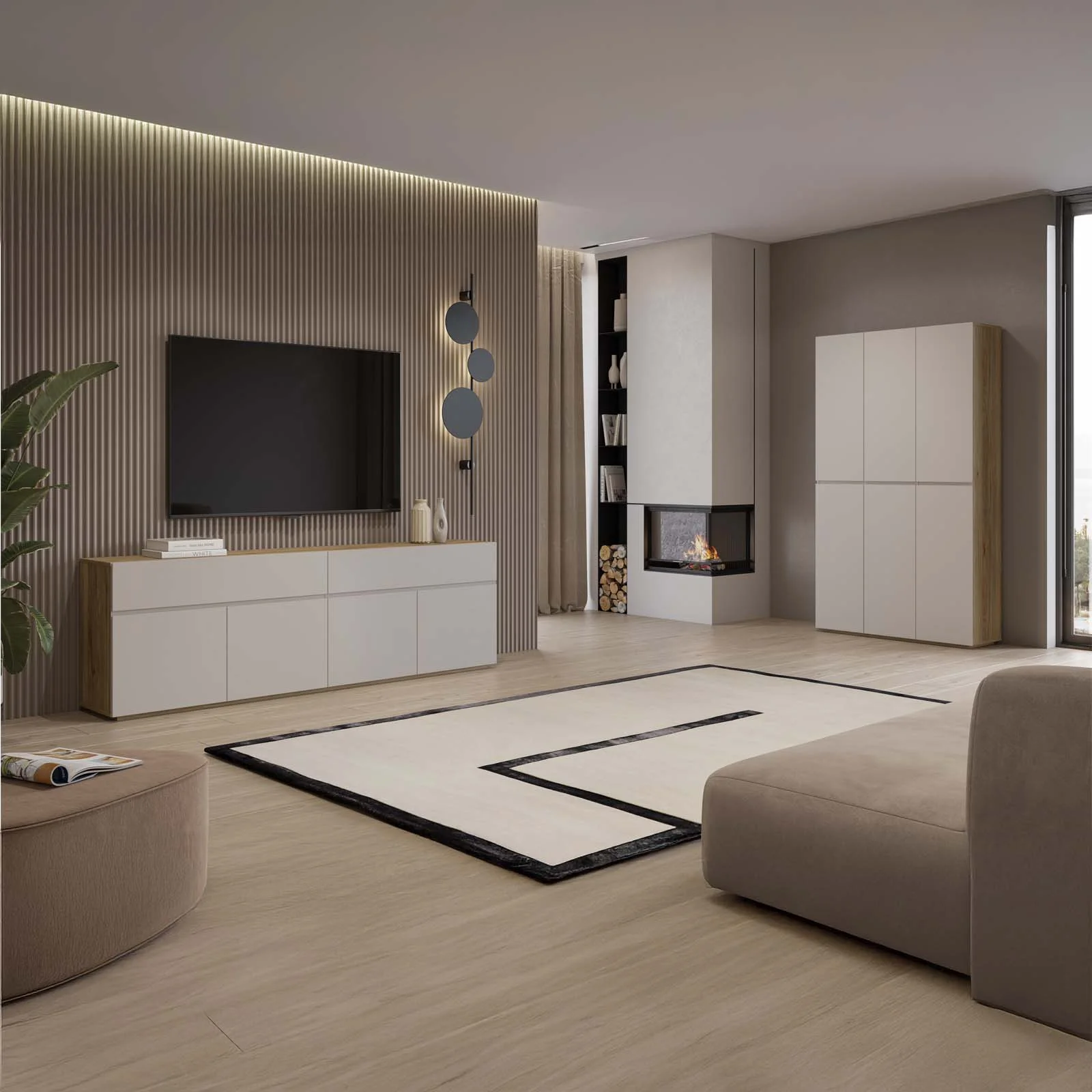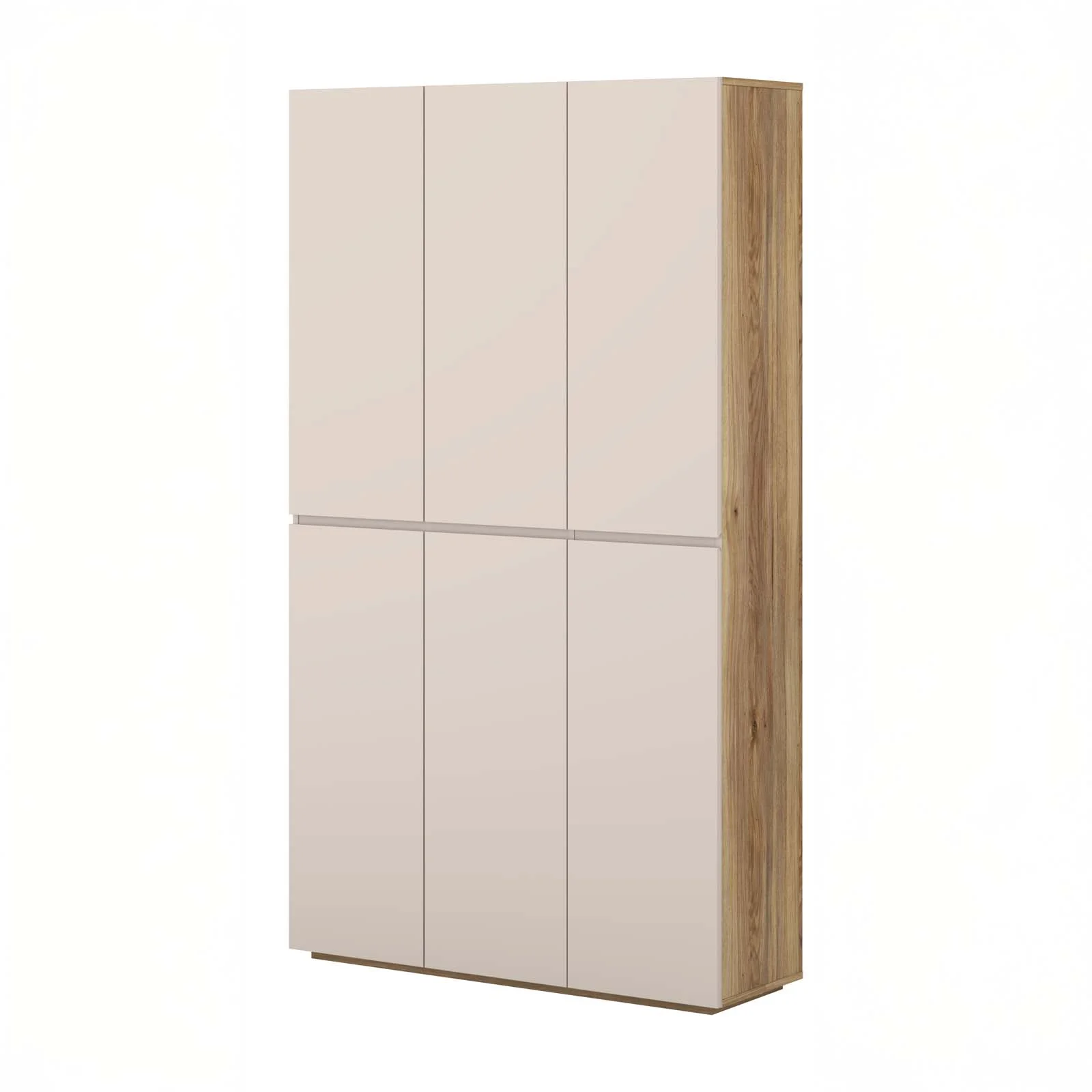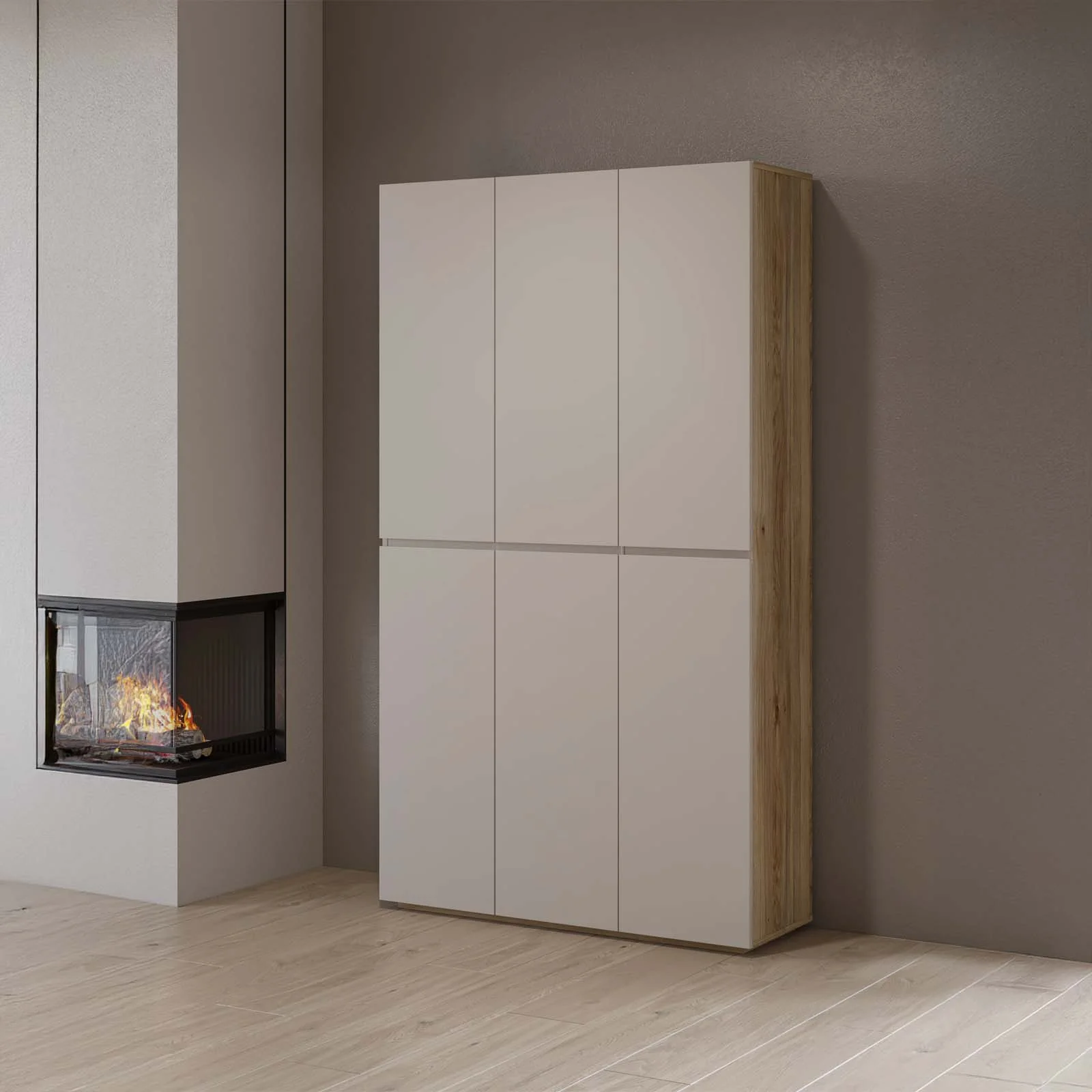 Il raffinato contrasto cashmere e rovere aggiunge un tocco moderno e accogliente, facile da abbinare a qualsiasi arredamento. Le linee pulite e la totale assenza di maniglie a vista esaltano il design essenziale, rendendola discreta ma di carattere.