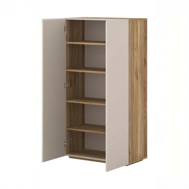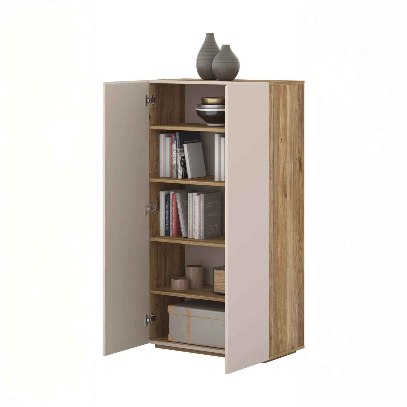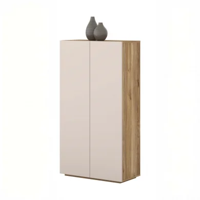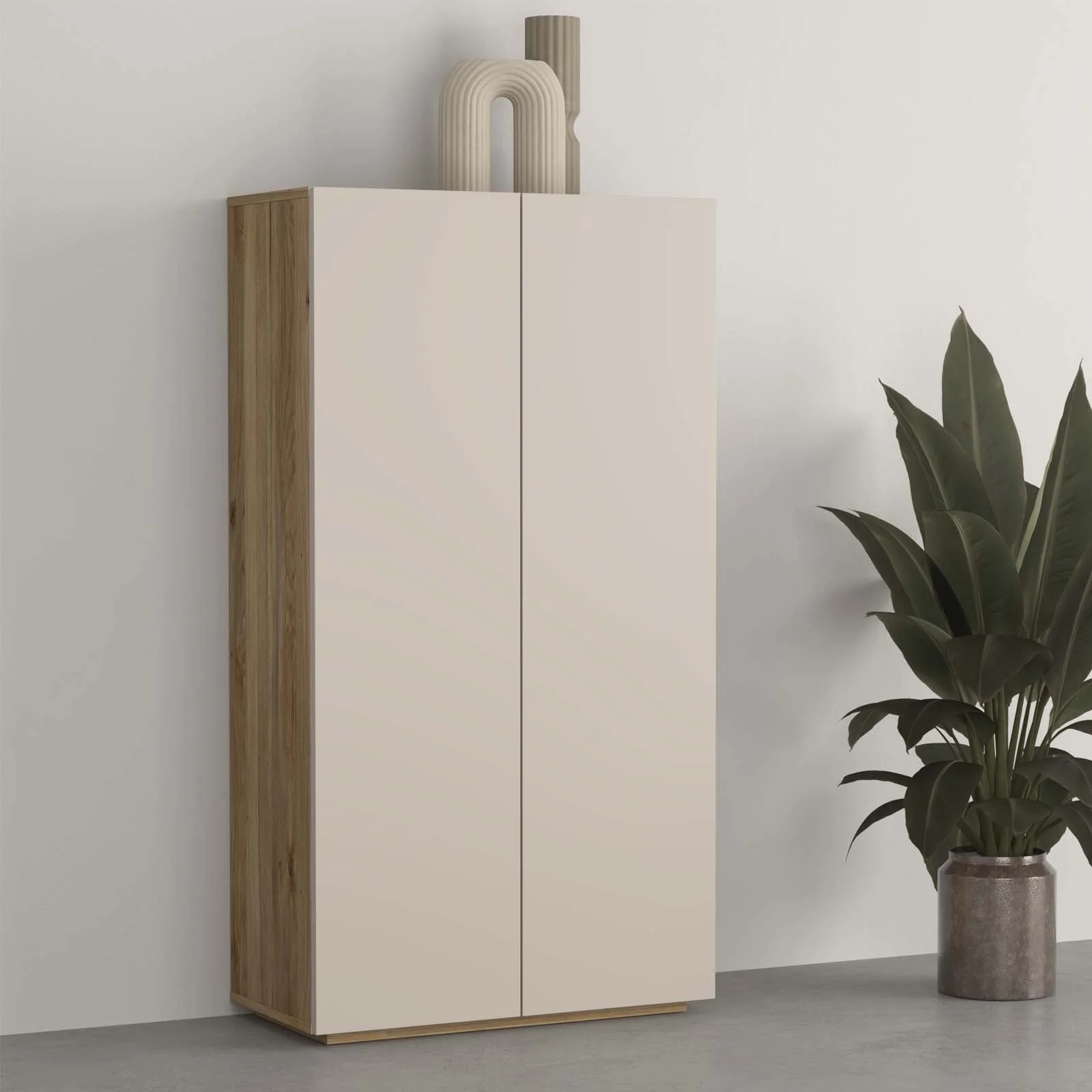 La finitura cashmere abbinata al rovere dona al mobile uno stile sobrio e contemporaneo, facile da coordinare con arredi chiari, minimal o naturali. Le ante lisce senza maniglie a vista, dotate di apertura a presa integrata, conferiscono un aspetto pulito ed essenziale, perfetto in ogni ambiente.