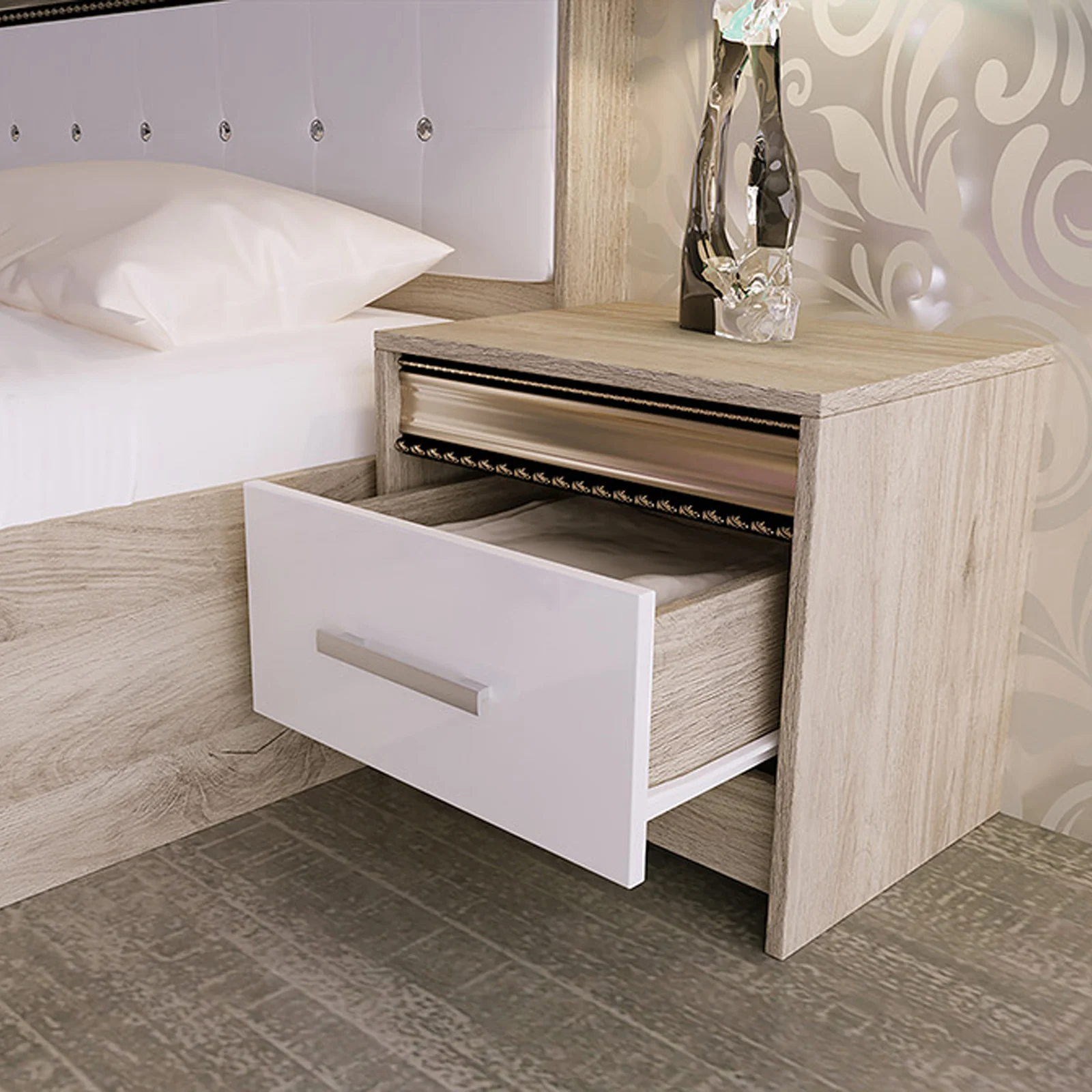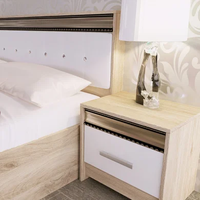 Il letto matrimoniale con contenitore è il protagonista della stanza: impreziosito da una testiera imbottita in ecopelle bianca con bottoni crystal, unisce estetica e funzionalità. A completare la composizione: