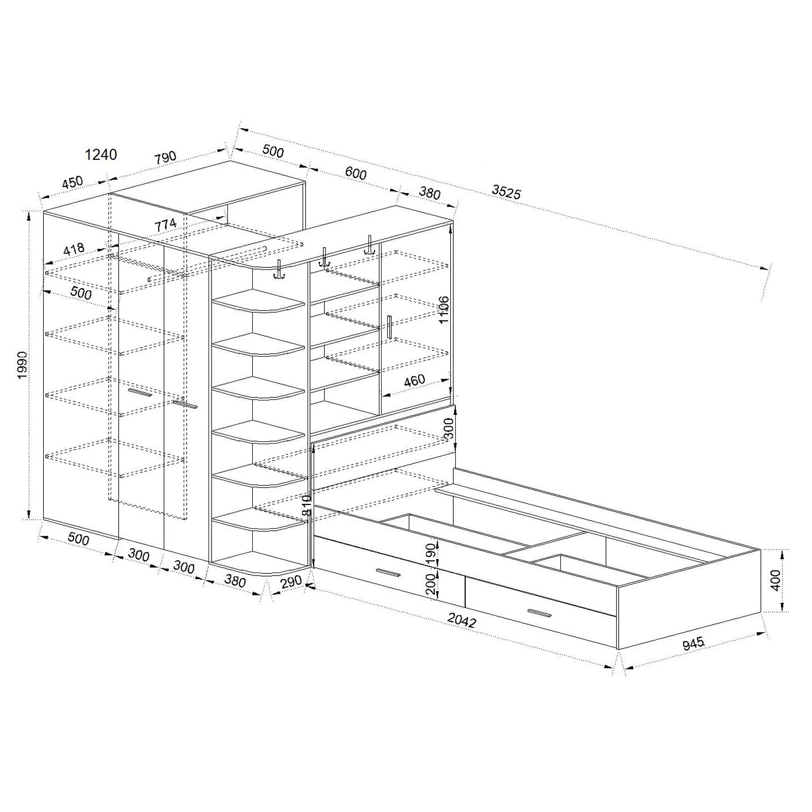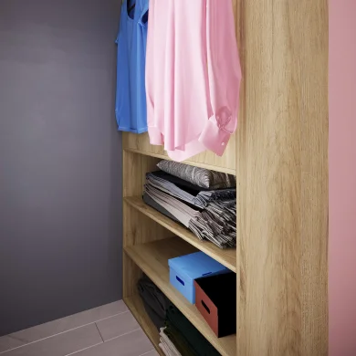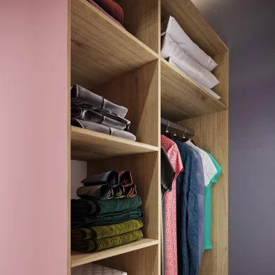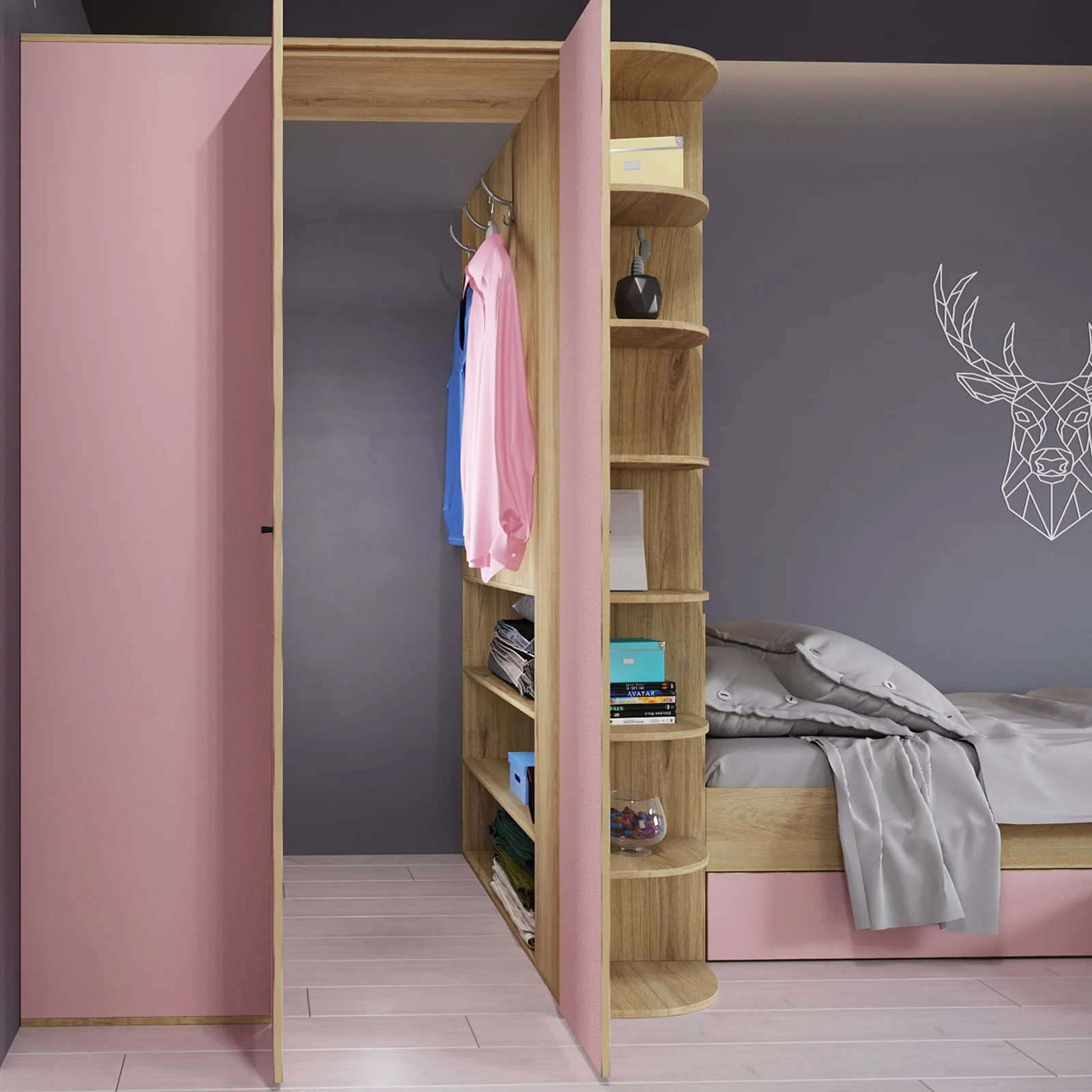 Fabio Gihome® è una cameretta composta da un letto singolo e una capiente cabina armadio, il tutto realizzato nella finitura bicolore rosa e rovere. La cabina armadio è dotata nella parte esterna di una libreria ad angolo composta da 6 ripiani, a fianco una seconda libreria con 3 ripiani e infine un'anta battente dietro la quale si nascondono altri 3 ripiani, per ritirare tutto ciò che non deve essere lasciato a vista. L'interno della cabina armadio è invece organizzato con 3 ganci appendiabiti e 3 ripiani sulla parte di destra, mentre sull'altro lato è presente 1 tubo appendiabiti con 1 ripiano superiore e a lato una colonna con 4 ripiani. Il letto, in misura 90x200 cm, è fornito di due comodi cassettoni estraibili dotati di pratiche rotelle per facilitare l’estrazione e garantirti il massimo comfort. Saranno perfetti per tenere ordinati i giochi o per ritirare le coperte per il cambio di stagione! La composizione non è reversibile, ma il letto può eventualmente staccarsi dalla composizione e essere posizionato in un altro posto della stanza.