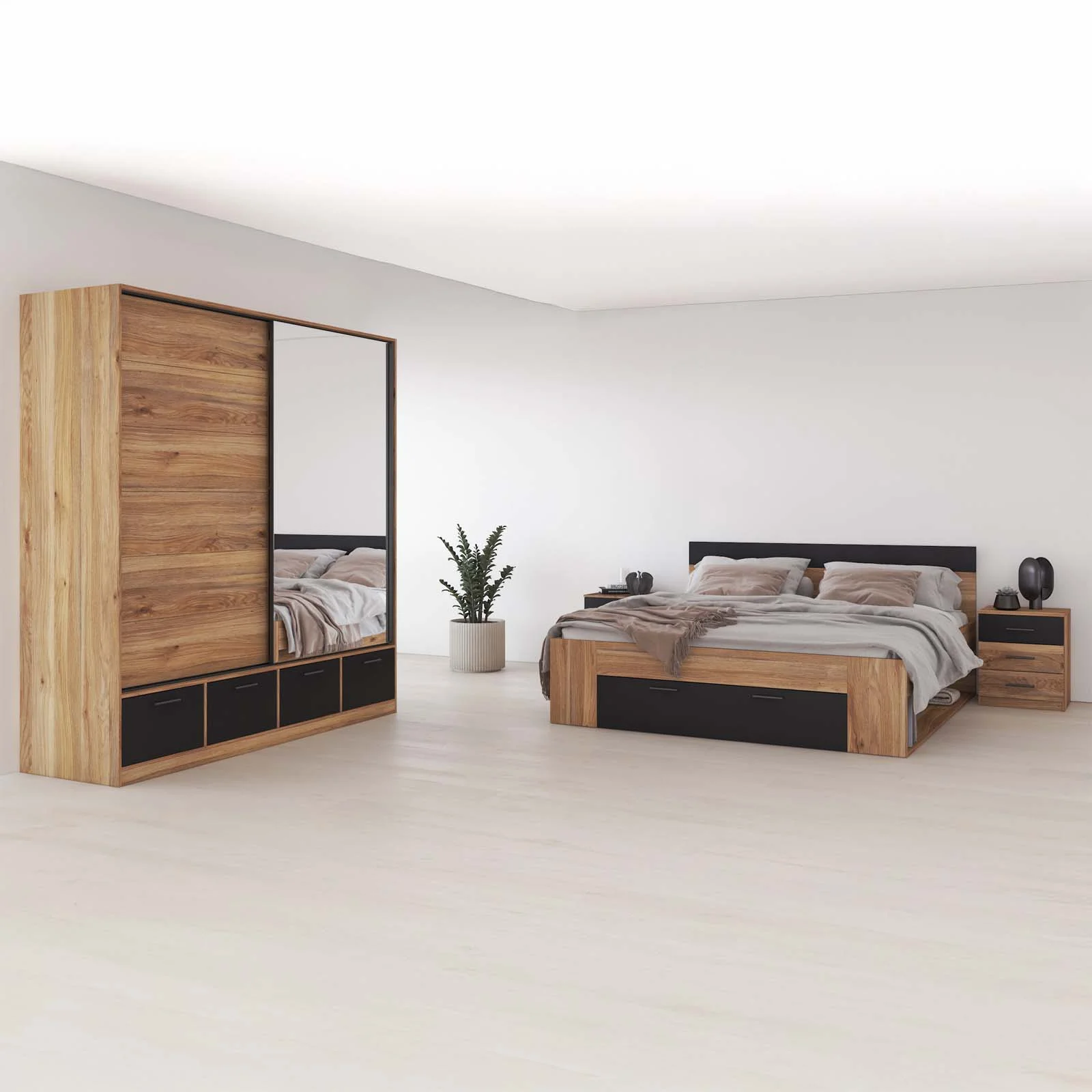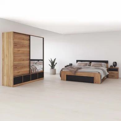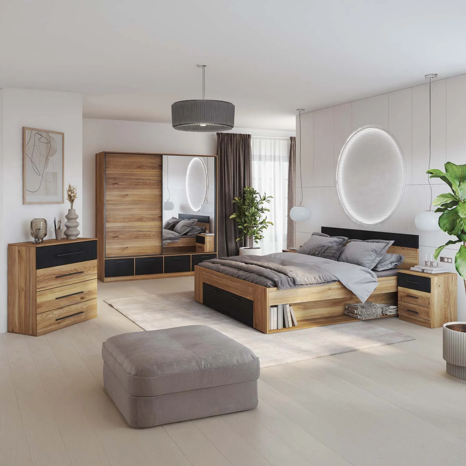 La combinazione del rovere caldo con i dettagli in nero opaco regala un design raffinato e contemporaneo, capace di valorizzare la camera da letto con un tocco deciso e di tendenza.