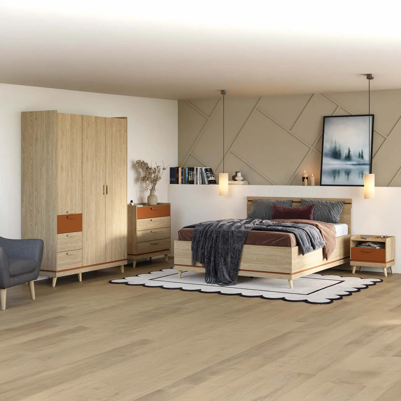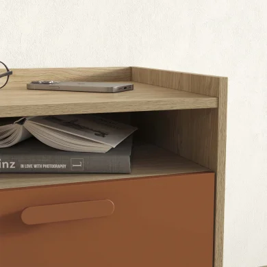 Grazie alla finitura in rovere e ai dettagli in rosso mattone, questo mobile unisce modernità e calore, risultando facilmente abbinabile a legni naturali e tonalità neutre.