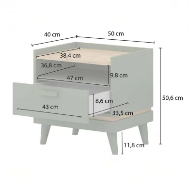 Il cassetto con guida metallica è ideale per riporre oggetti personali e tenerli sempre a portata di mano, mentre il ripiano a giorno offre spazio pratico per libri, riviste o accessori.