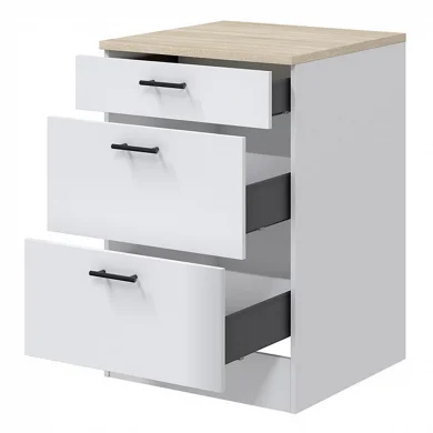 La composizione Kimera 3 è pensata per chi cerca una cucina compatta ma funzionale, capace di offrire spazi ben organizzati e uno stile moderno. È composta da un modulo base multiuso con anta, cassetto e ripiano interno, dal modulo dedicato all’incasso del forno e da un modulo base con un cassetto e due capienti cassettoni per pentole e stoviglie. A completare la struttura c’è una colonna alta multiuso con un ripiano fisso e due regolabili, ideale per sfruttare al meglio lo spazio in verticale.