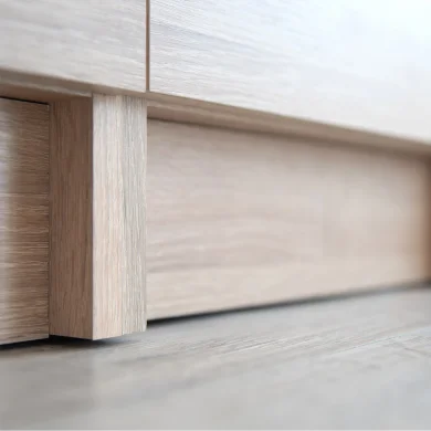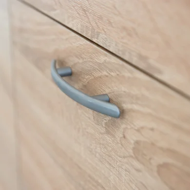La base è composta da quattro moduli: un mobile sottolavello a due ante, un modulo con anta singola, uno dotato di anta e cassetto e un modulo dedicato all’incasso del forno, che consente di integrare perfettamente gli elettrodomestici mantenendo un aspetto ordinato e coerente.