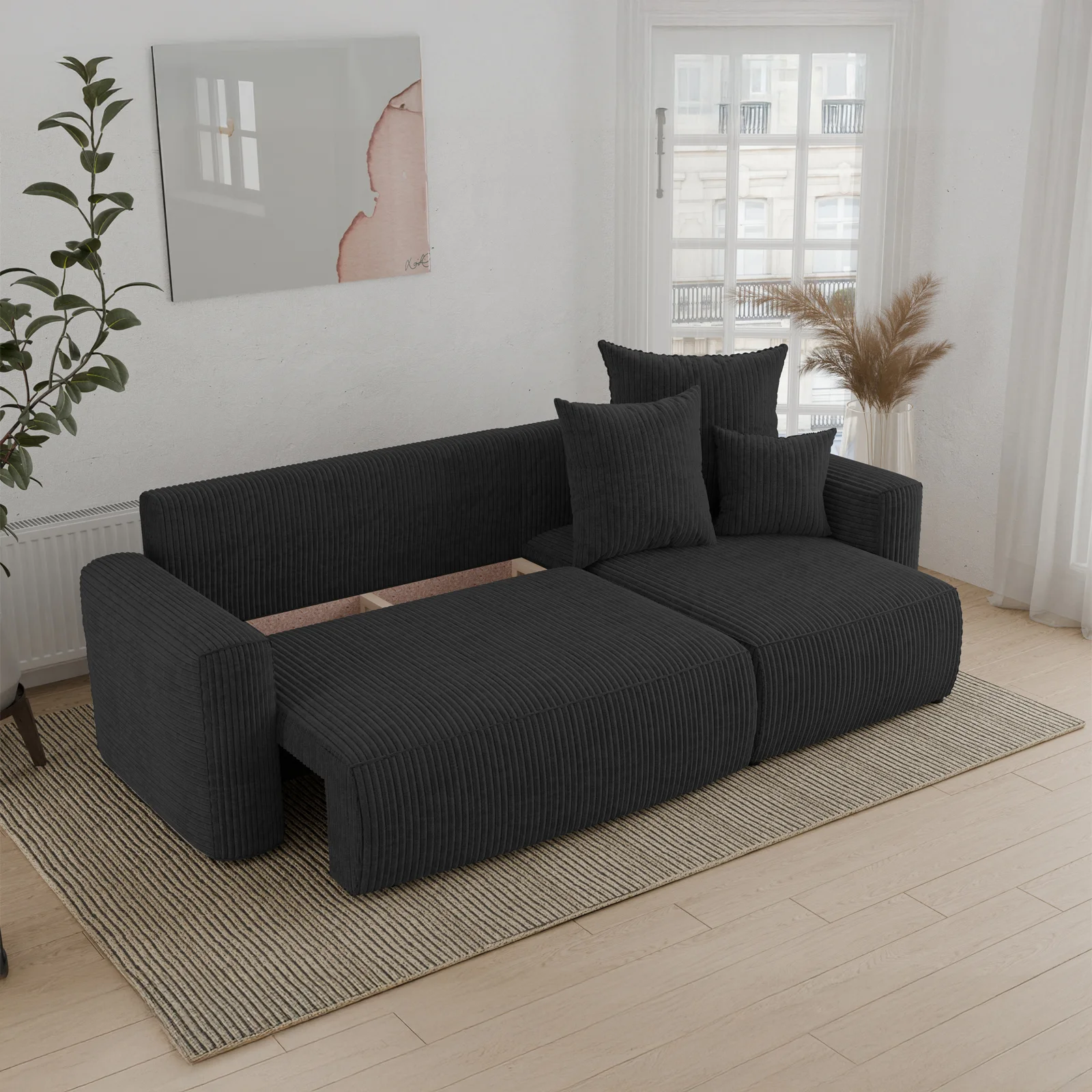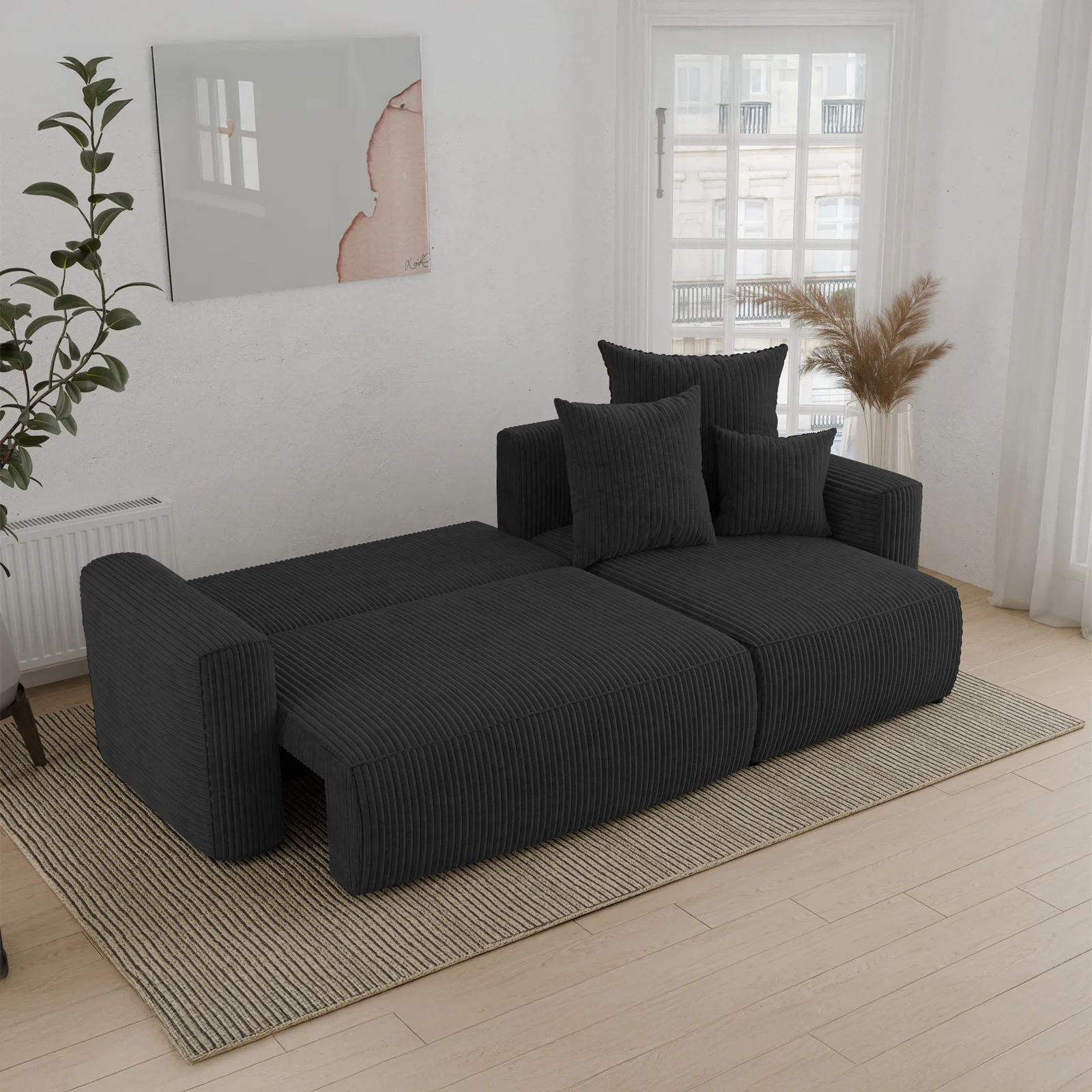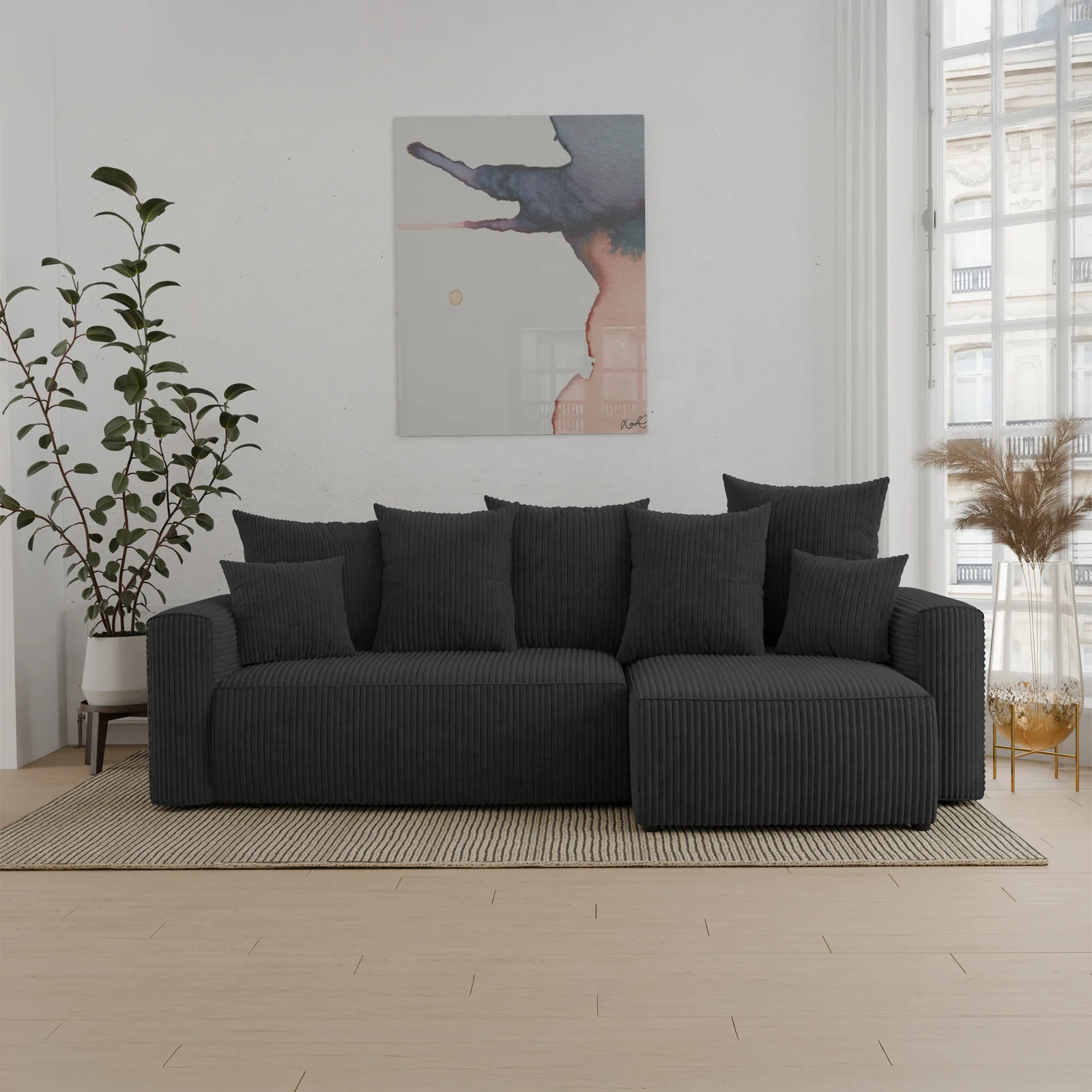 Divano letto angolare reversibile 238x142cm velluto a coste nero Scintilla Il divano letto angolare Scintilla è la perfetta combinazione di comfort, eleganza e praticità. Rivestito in un morbido velluto... continua a leggere
