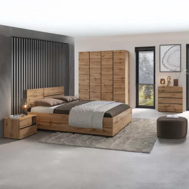 La finitura rovere valorizza la naturalezza del legno con venature calde e autentiche, capaci di trasmettere accoglienza e armonia. I dettagli interni in nero, tratto distintivo della collezione, aggiungono un tocco di modernità e contrasto sofisticato.
