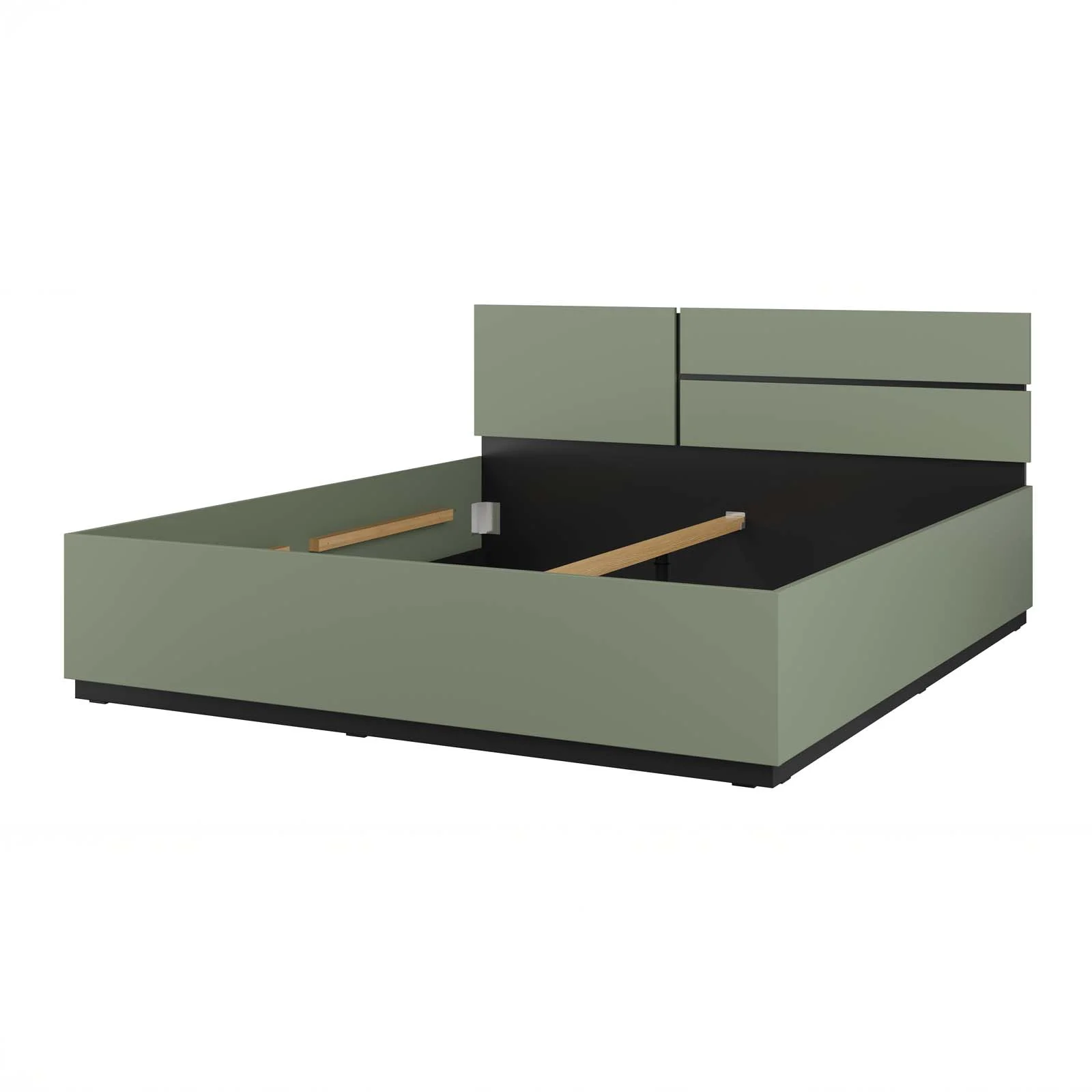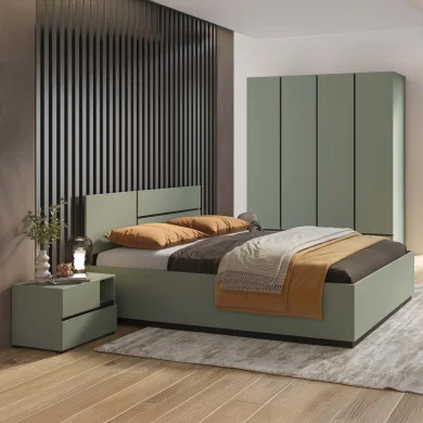 Il letto matrimoniale oversize della collezione Lolla è il cuore della zona notte: un arredo che unisce estetica, comfort e funzionalità. La sua finitura verde opaco crea un’atmosfera rilassante e avvolgente, mentre le rifiniture interne in nero donano un carattere moderno e deciso, tipico della collezione.