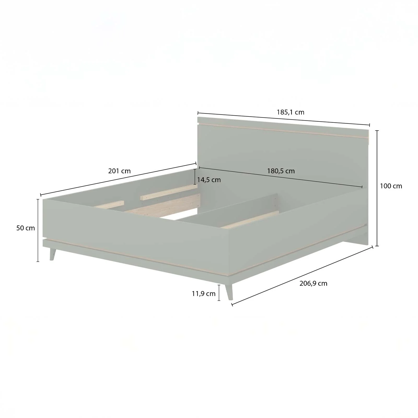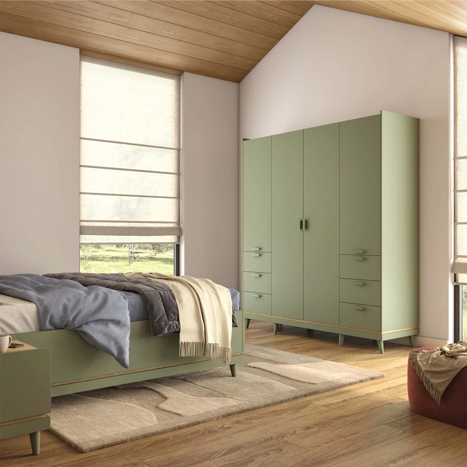 La finitura in verde salvia opaco, arricchita da dettagli in rovere, esprime eleganza e modernità in perfetto stile nordico. I piedini alti 12 cm alleggeriscono la struttura e facilitano la pulizia del pavimento.