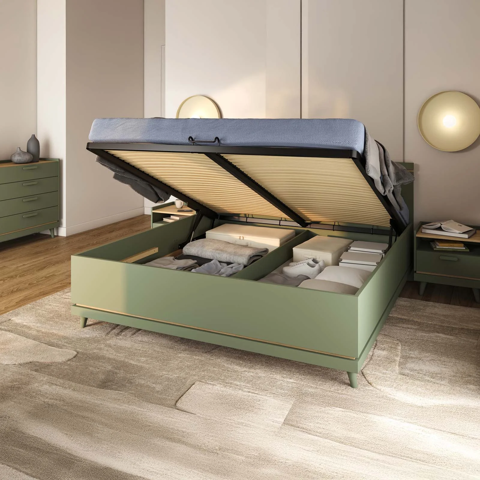Grazie al vano contenitore integrato, accessibile sollevando la rete a doghe inclusa, è possibile riporre biancheria, cuscini e coperte in modo pratico e ordinato, ottimizzando lo spazio della camera.