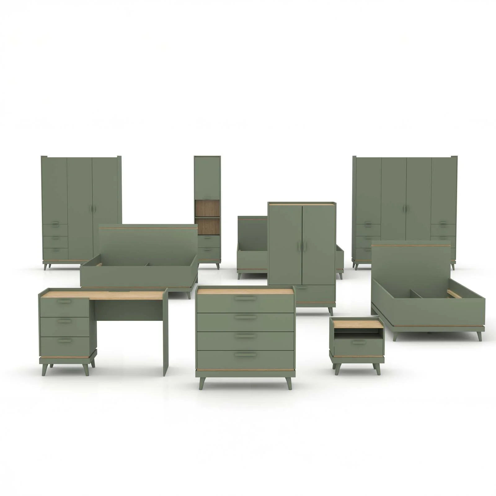 La finitura verde salvia opaca abbinata al rovere naturale dona carattere ed eleganza, capace di adattarsi a diversi stili d’arredo, dalle tonalità neutre ai legni chiari, creando un’atmosfera fresca e contemporanea.