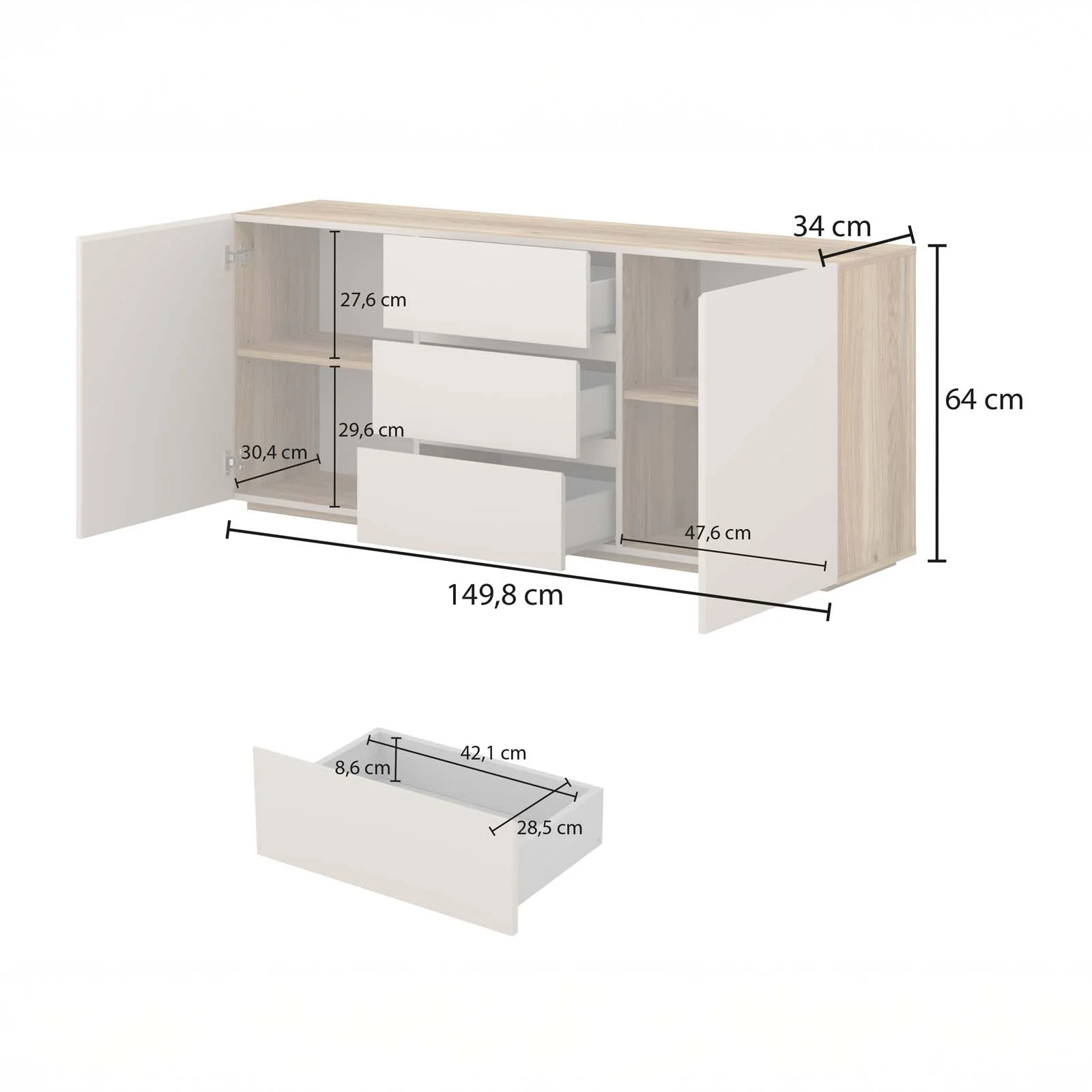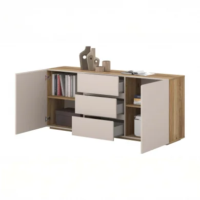 al centro si trovano 3 cassetti, ideali per riporre oggetti di piccole e medie dimensioni, mentre le 2 ante poste ai lati nascondono 4 vani interni, perfetti per piatti, bicchieri, documenti o accessori per la casa.