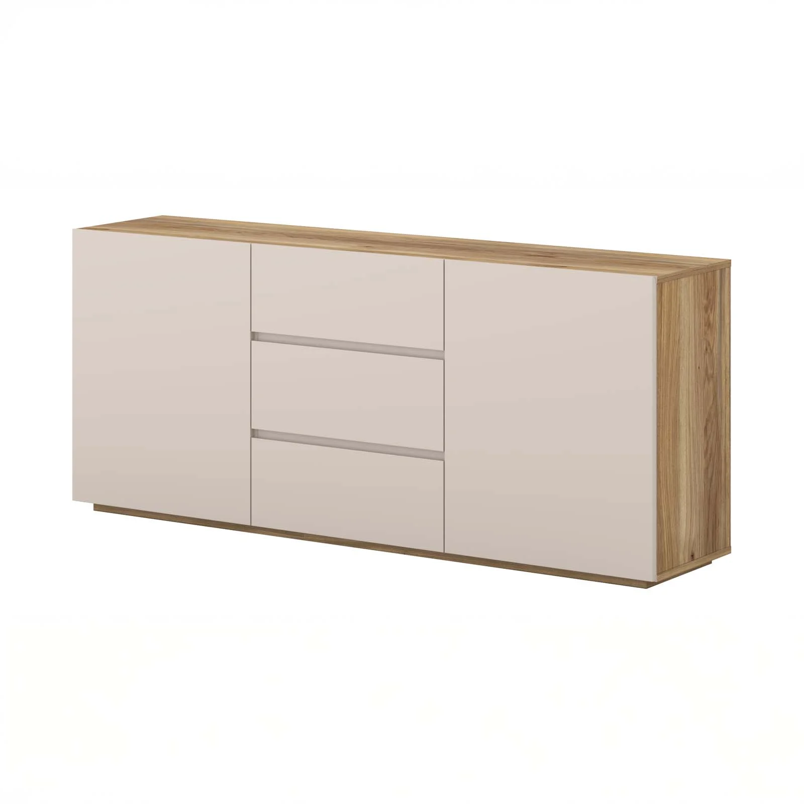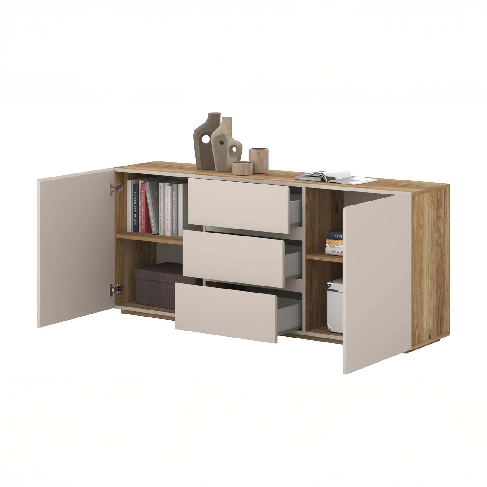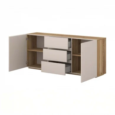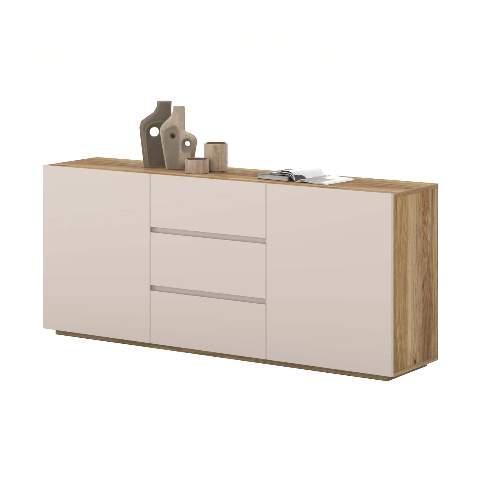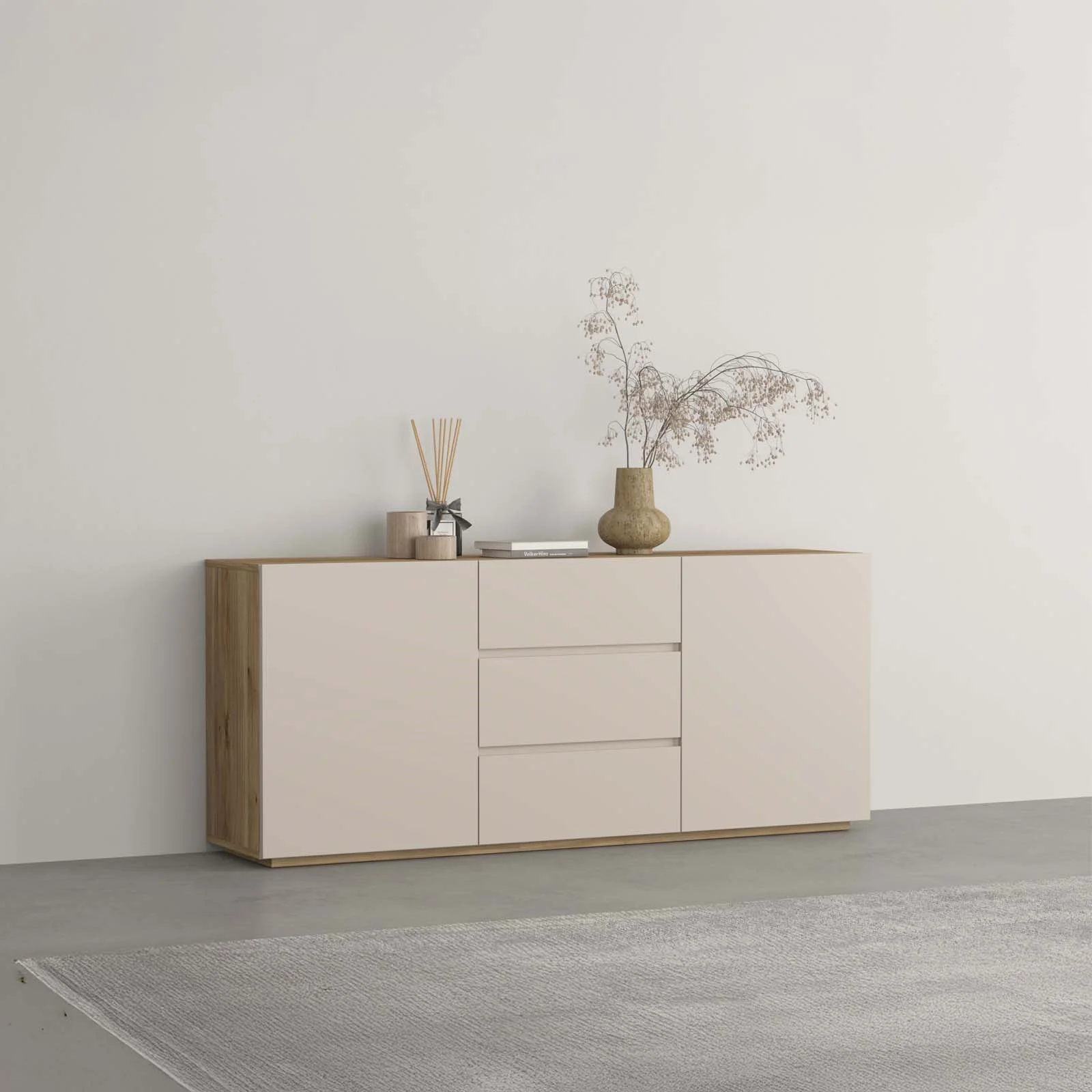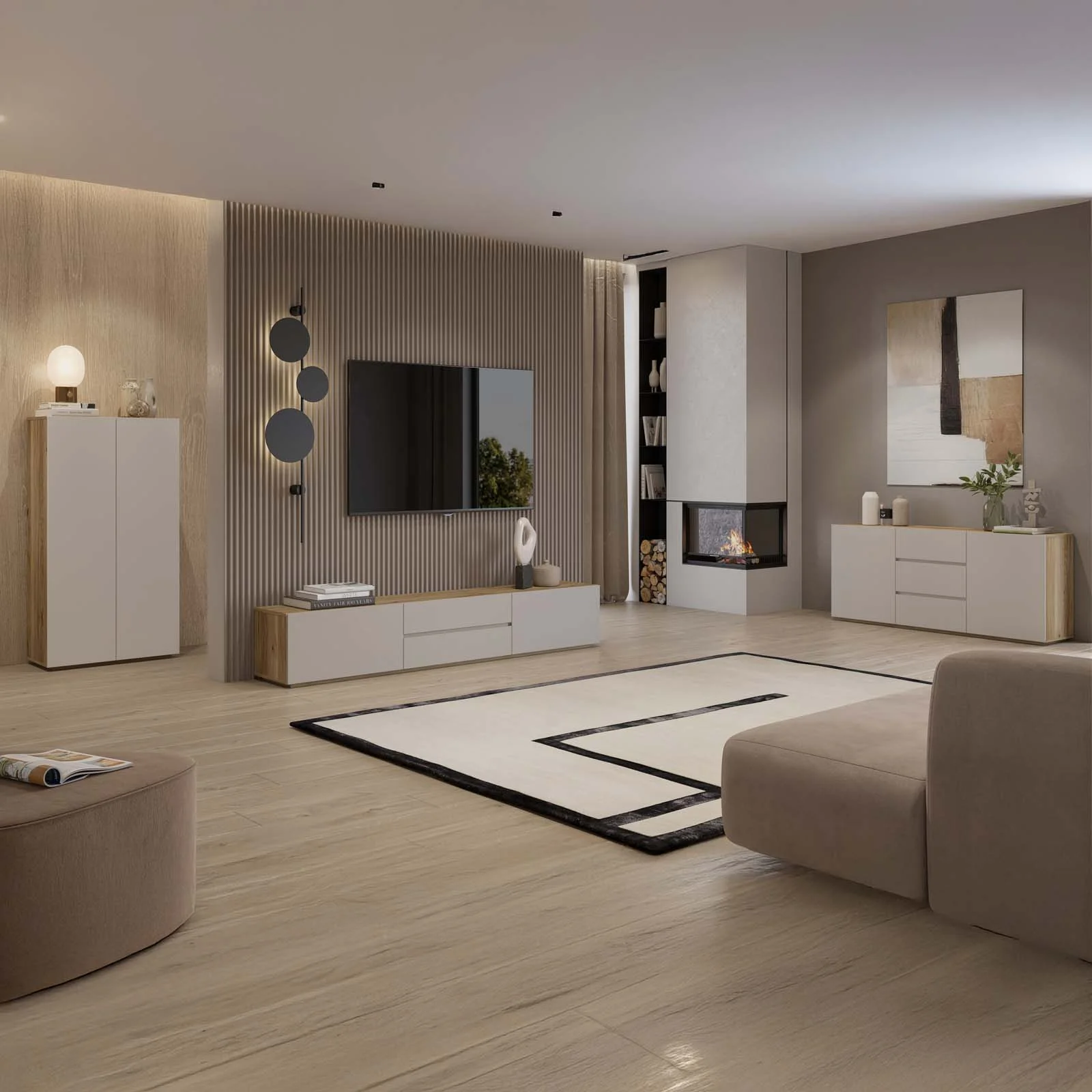 La finitura cashmere abbinata al rovere crea un equilibrio perfetto tra tonalità calde e neutre, capace di valorizzare qualsiasi zona living, ingresso o sala da pranzo. Le superfici lisce e le linee pulite donano al mobile un’estetica minimale, senza maniglie a vista grazie all’apertura con bordo sagomato.