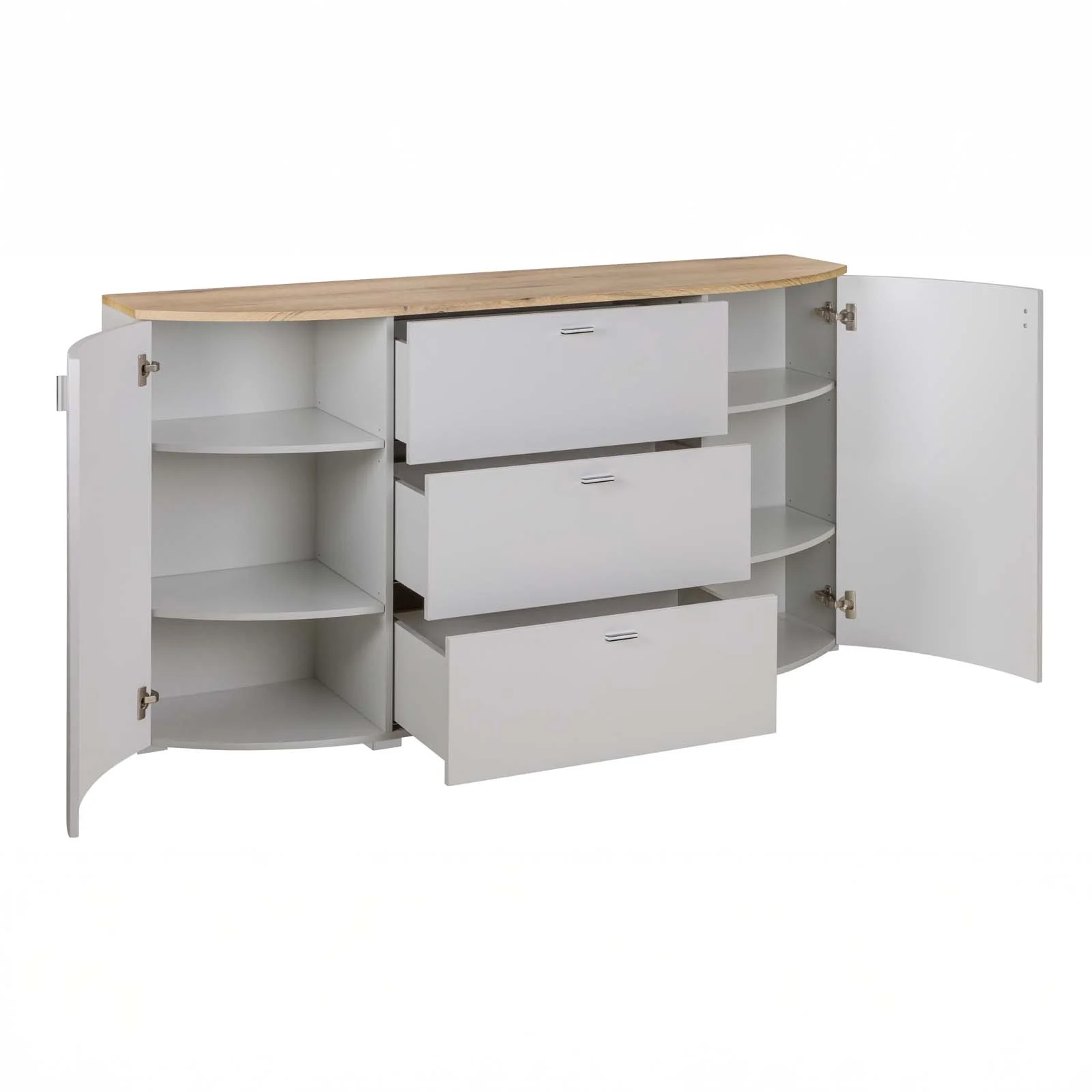All’interno delle 2 ante battenti trovano posto 4 ripiani e 6 vani, ideali per stoviglie, tessili o oggetti utili alla vita quotidiana, mentre i 3 cassetti scorrevoli offrono ulteriore spazio pratico per accessori e piccoli oggetti.