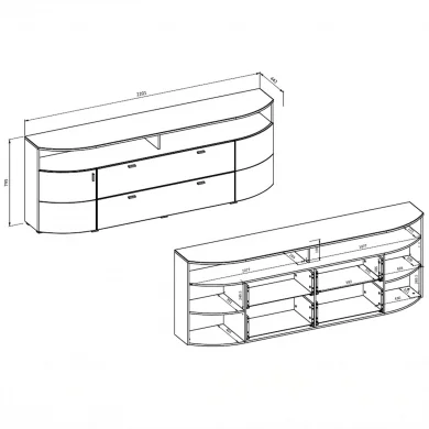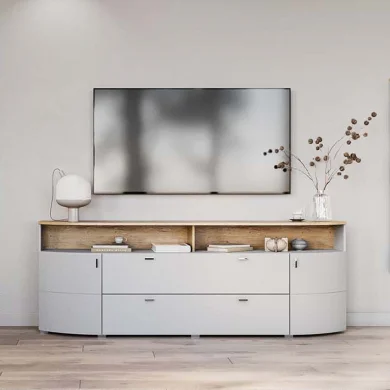 La struttura è composta da 2 ante battenti, 2 cassetti scorrevoli e 2 vani a giorno, ideali per ospitare dispositivi multimediali, libri o oggetti decorativi. I 2 ripiani interni ampliano la capacità contenitiva, permettendo di organizzare al meglio lo spazio.