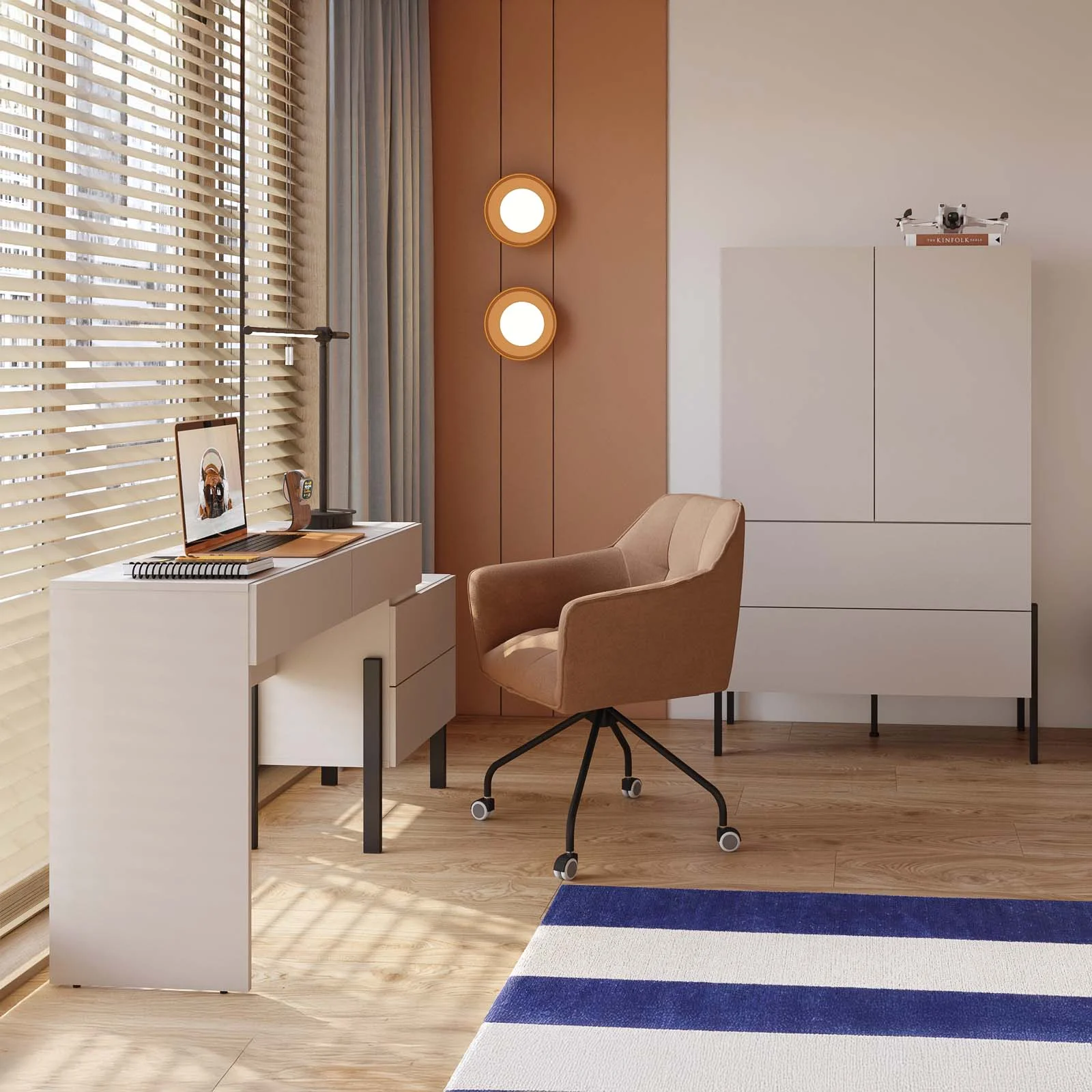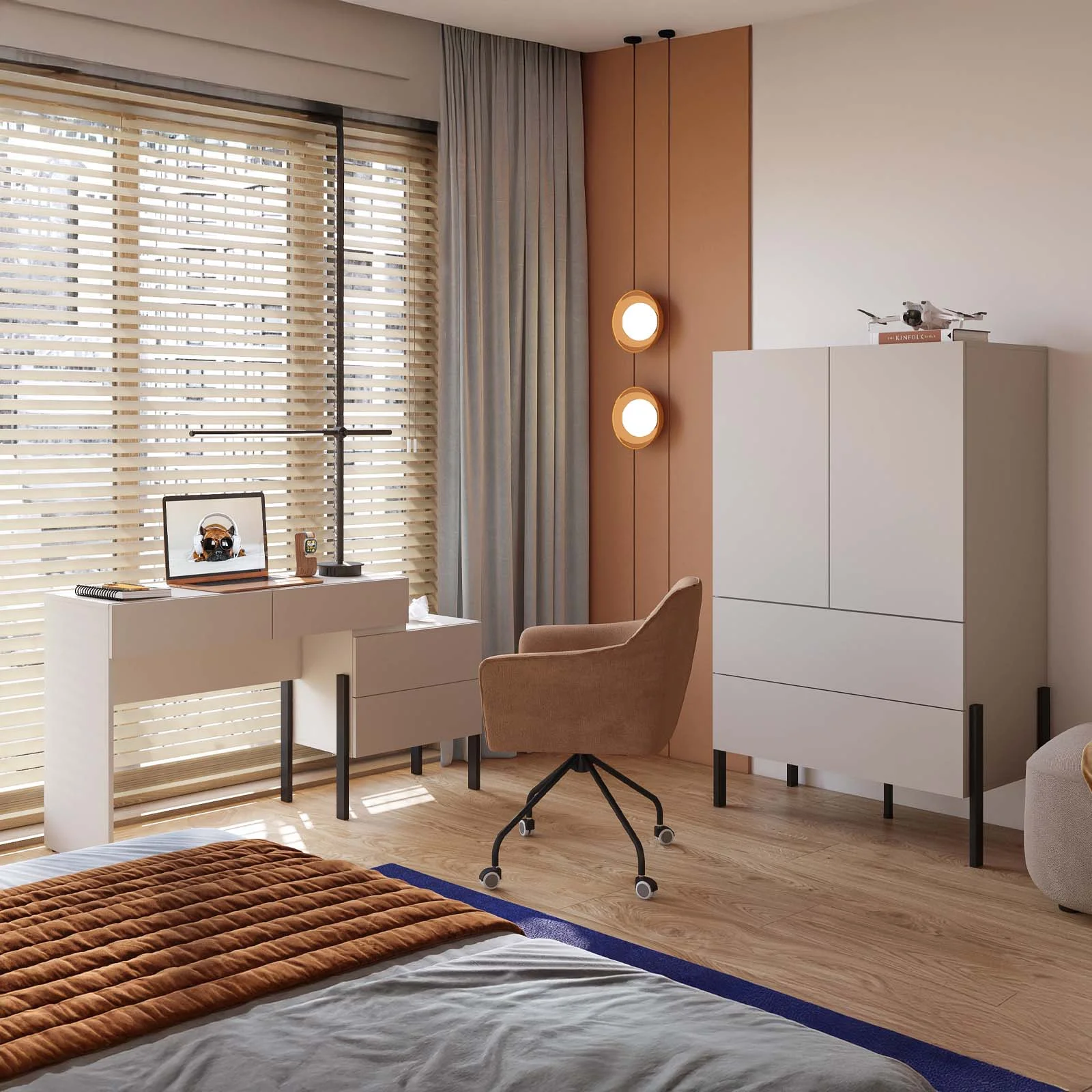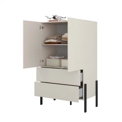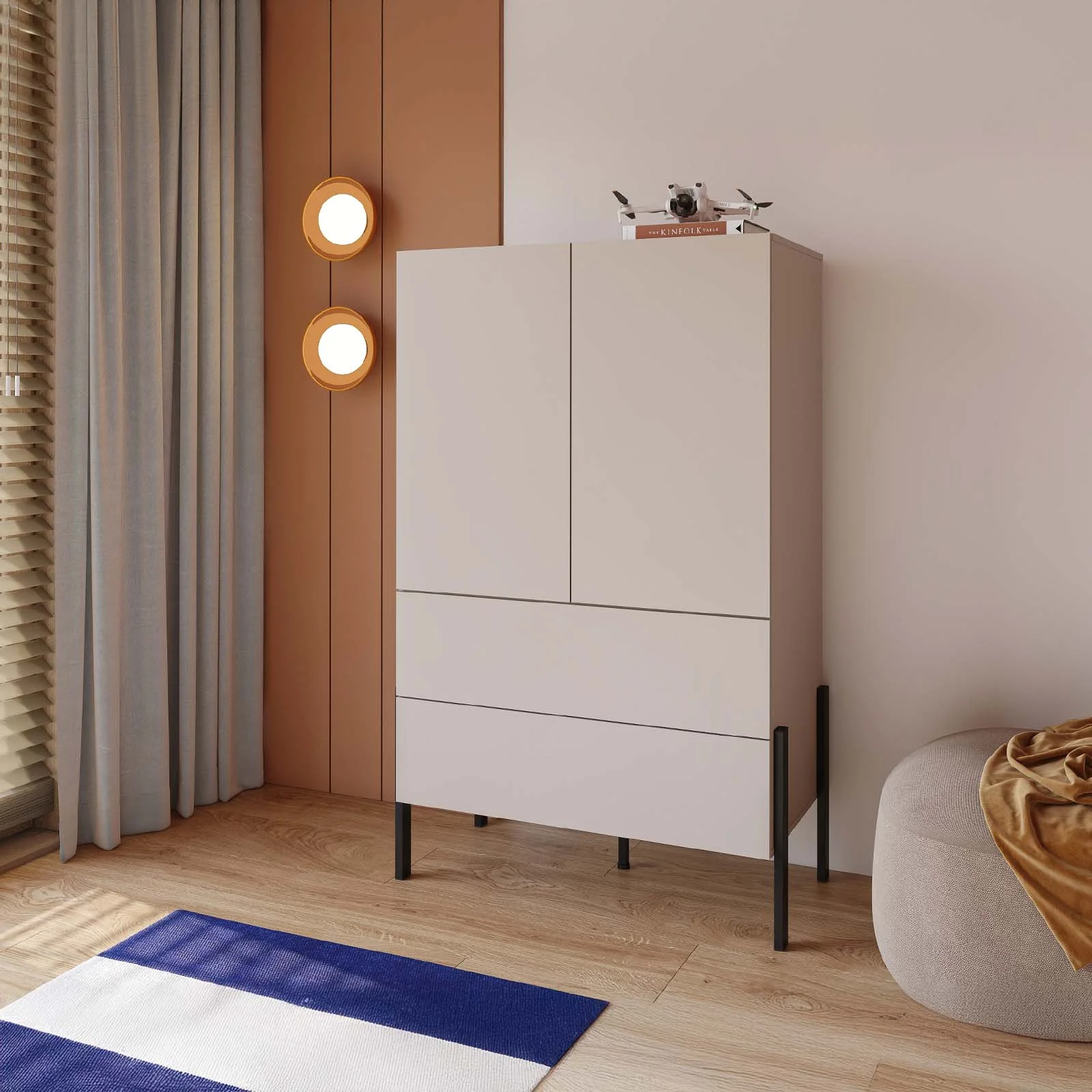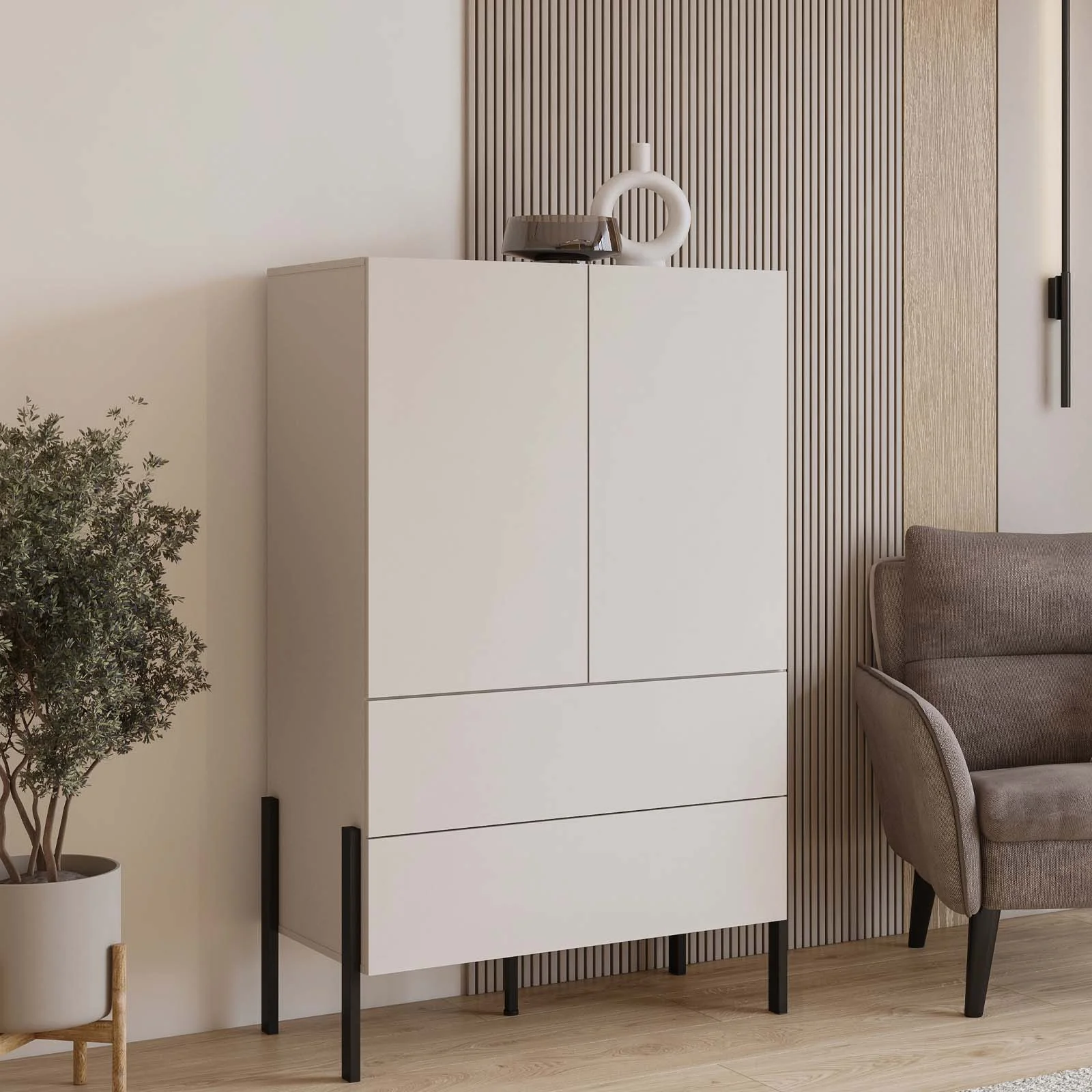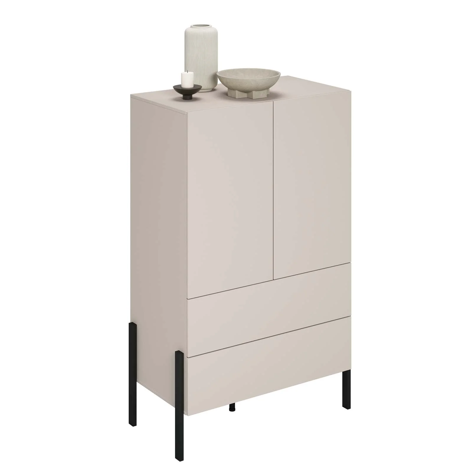 La finitura beige opaco conferisce al mobile luminosità ed eleganza, rendendolo facilmente abbinabile a diversi stili d’arredo. Le gambe in metallo nero opaco completano il design con un contrasto elegante e contemporaneo, garantendo al tempo stesso solidità e stabilità.