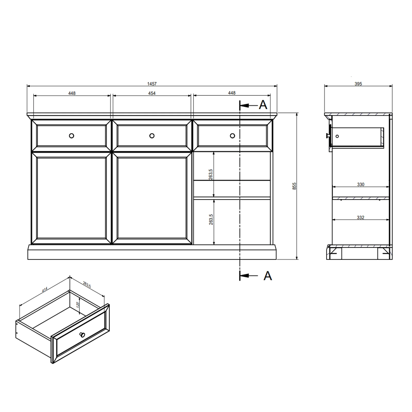 Ogni anta nasconde un ripiano interno che suddivide lo spazio in 2 vani ordinati, ideali per riporre stoviglie, tessili o oggetti di uso quotidiano, mentre i 3 cassetti centrali offrono praticità per custodire gli accessori più piccoli.