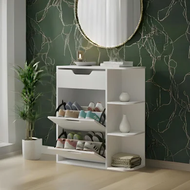 La struttura in pannello nobilitato melaminico garantisce solidità e resistenza nel tempo, mentre le cerniere metalliche assicurano un utilizzo pratico e durevole. I 2 vani a ribalta consentono di riporre le scarpe in modo ordinato e discreto, ottimizzando lo spazio, mentre il cassetto superiore è perfetto per accessori, chiavi o piccoli oggetti di uso quotidiano.