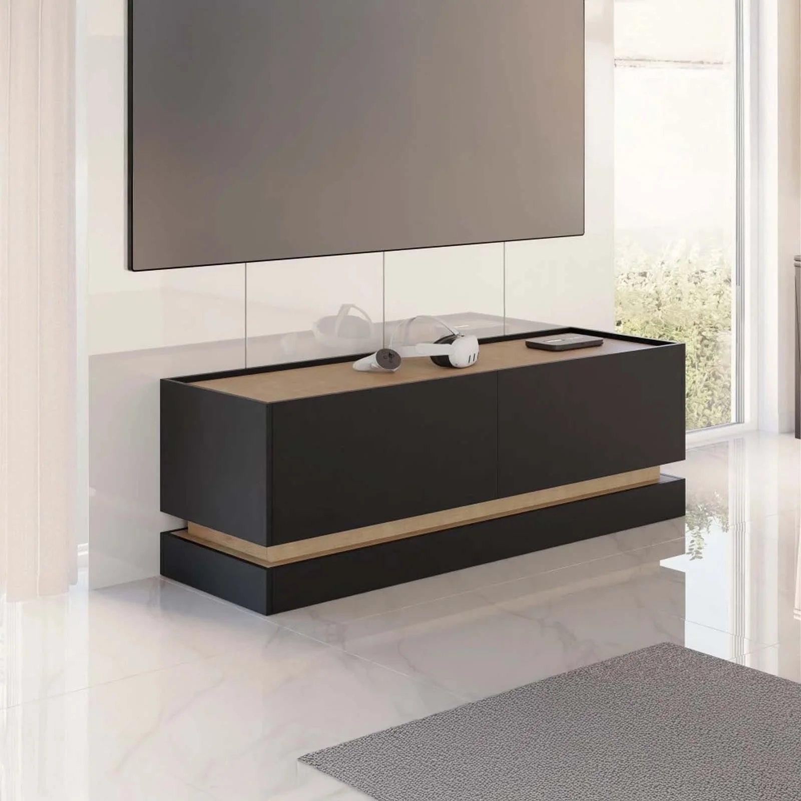 La finitura nera, riscaldata dal dettaglio in rovere, crea un contrasto elegante e contemporaneo, ideale per soggiorni moderni, ambienti industrial o spazi arredati con tonalità scure e sofisticate.