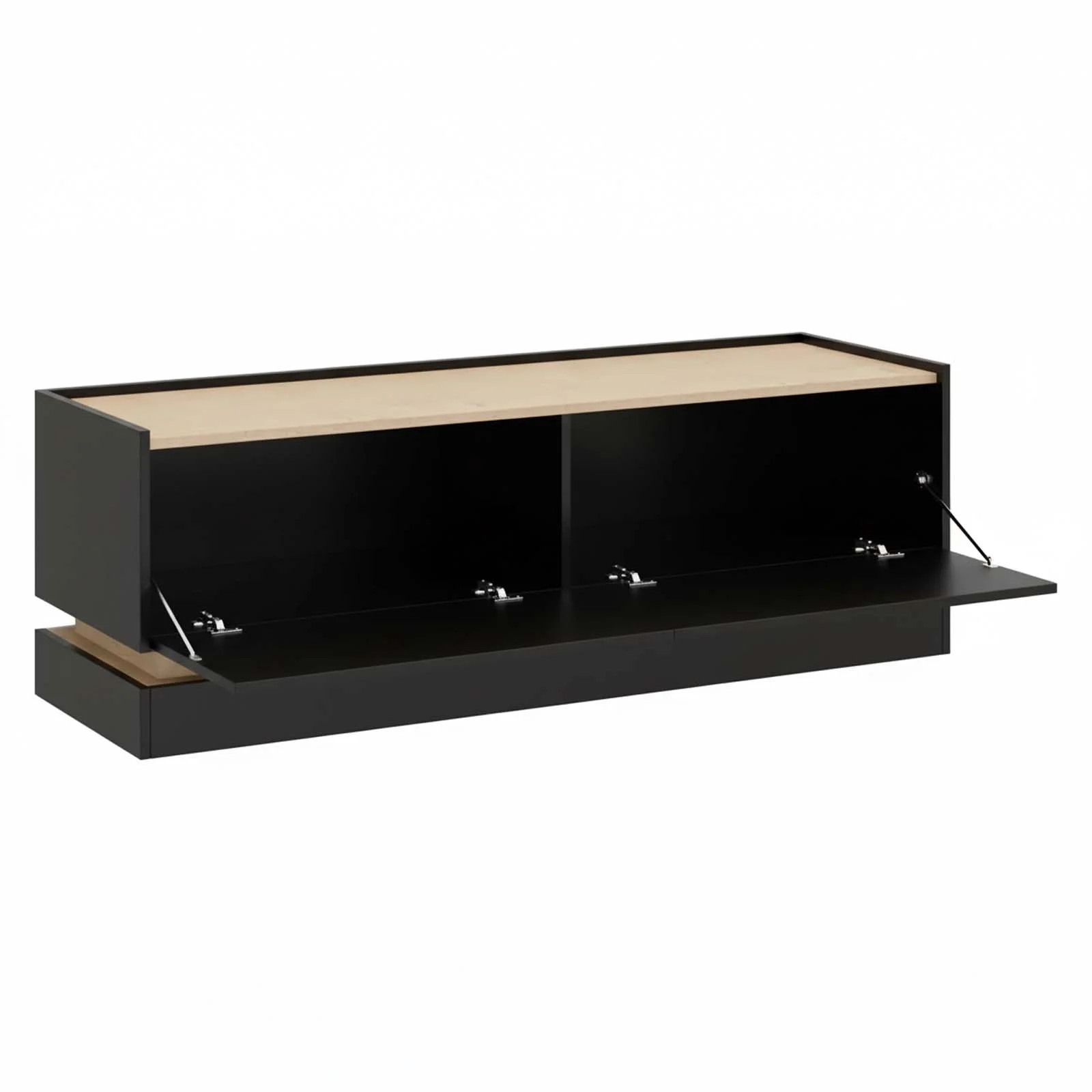 Le 2 ante a ribalta nascondono 2 vani interni capienti, pensati per organizzare con discrezione dispositivi multimediali, telecomandi, cavi o accessori hi-tech.