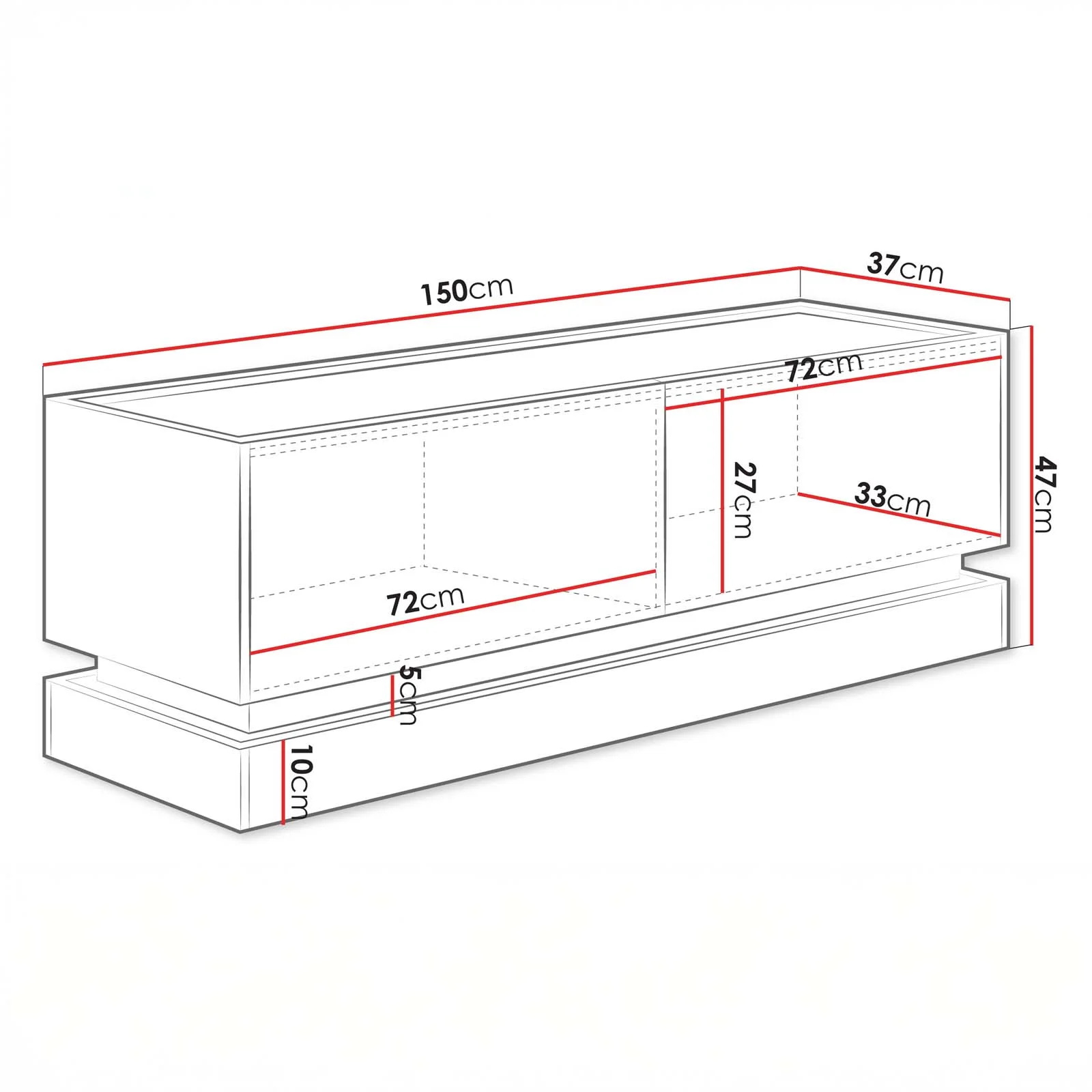 Con una lunghezza di 150 cm, offre un piano d’appoggio perfetto per TV di medie e grandi dimensioni, insieme a soundbar, console o elementi decorativi.