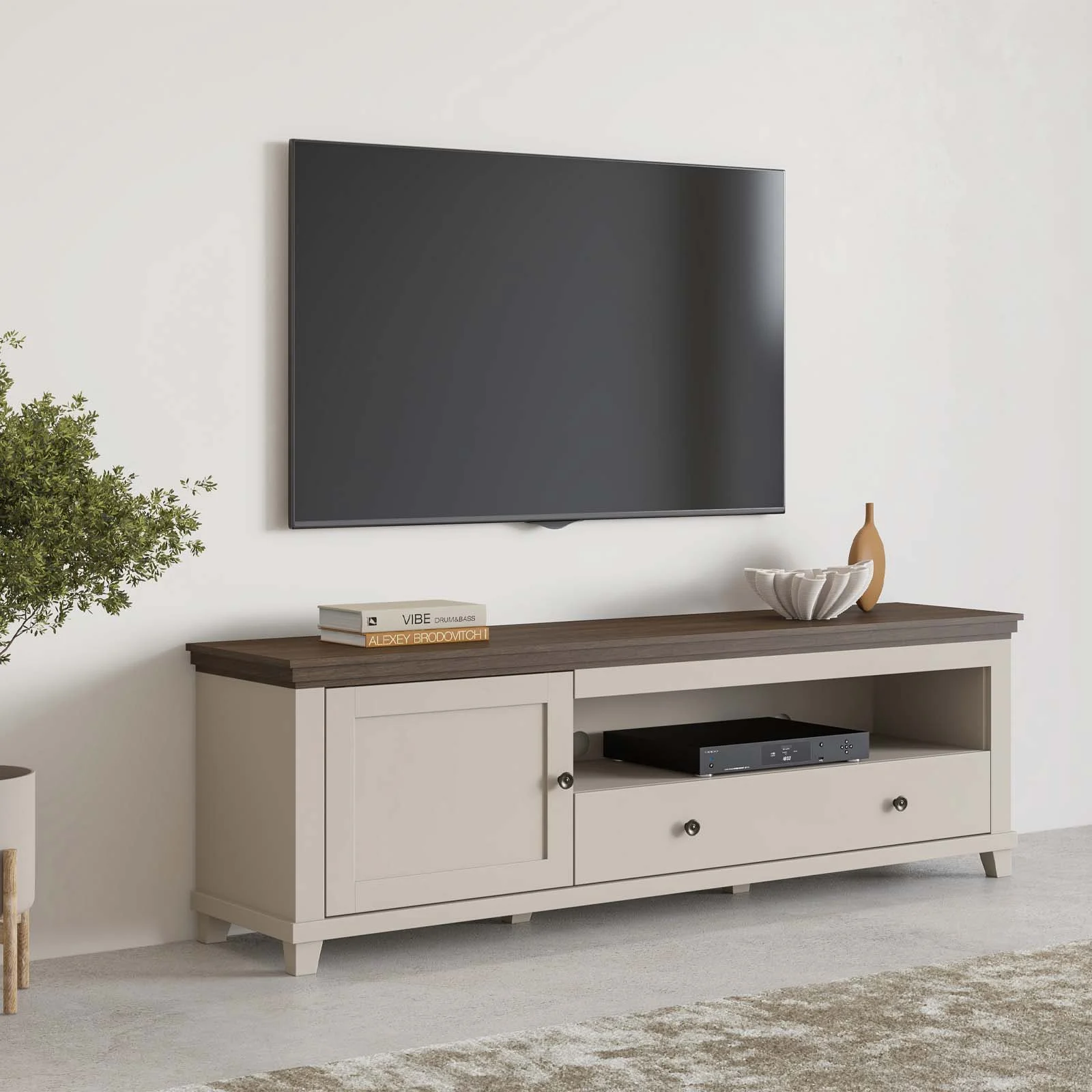 Il nuovo mobile TV Texel da 181x61h cm combina stile classico e praticità moderna, perfetto per arredare la zona giorno con eleganza. La finitura beige con top in rovere scuro dona un aspetto raffinato e senza tempo, facilmente abbinabile a diversi stili d’arredo.