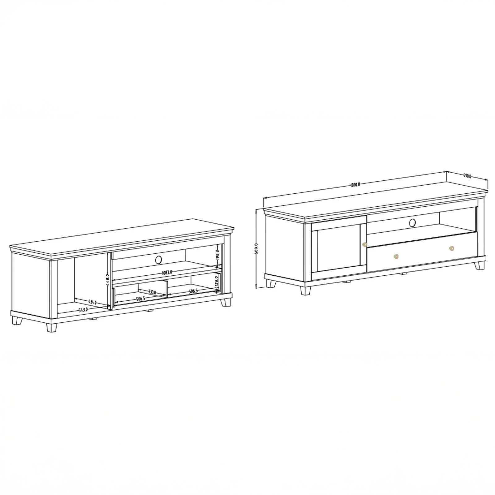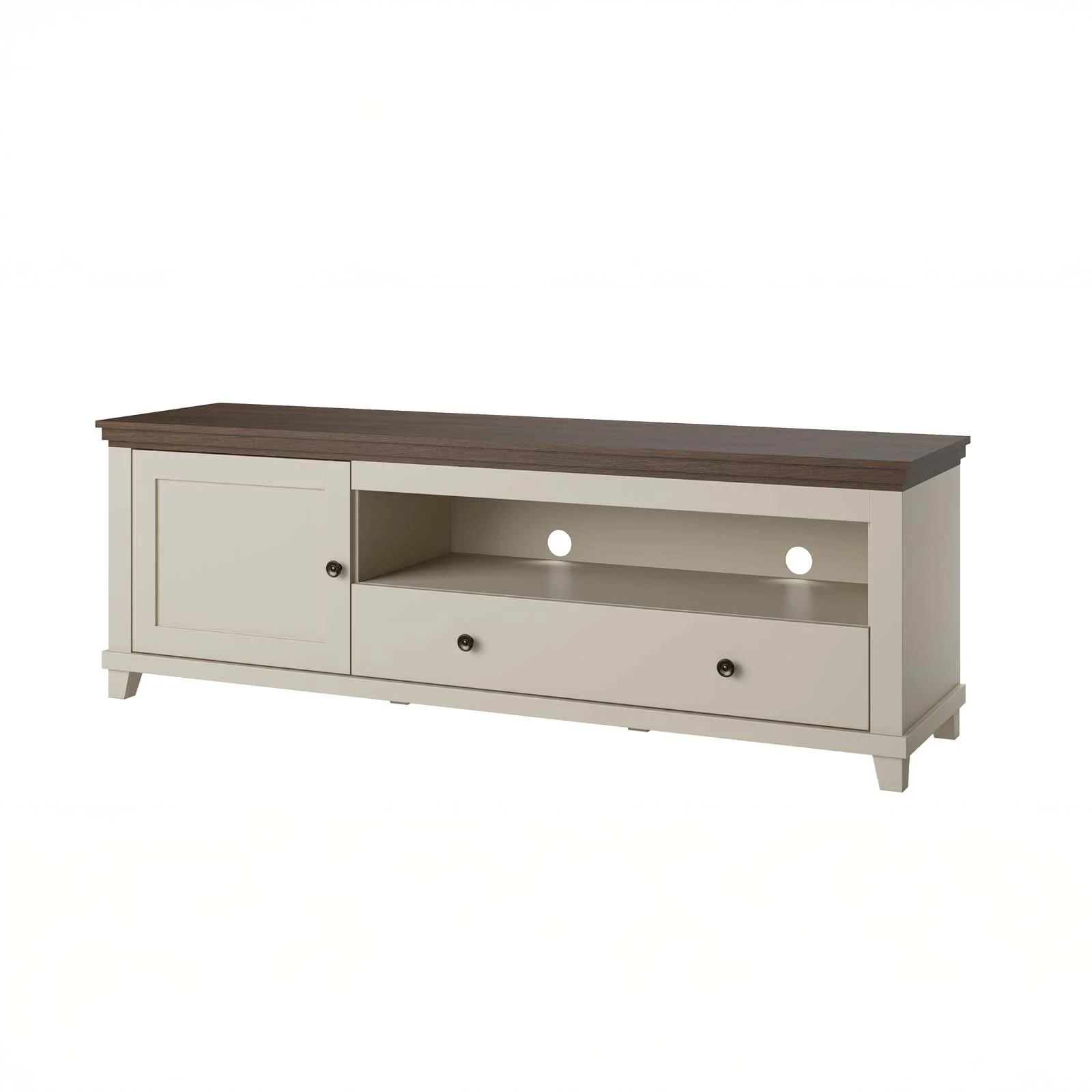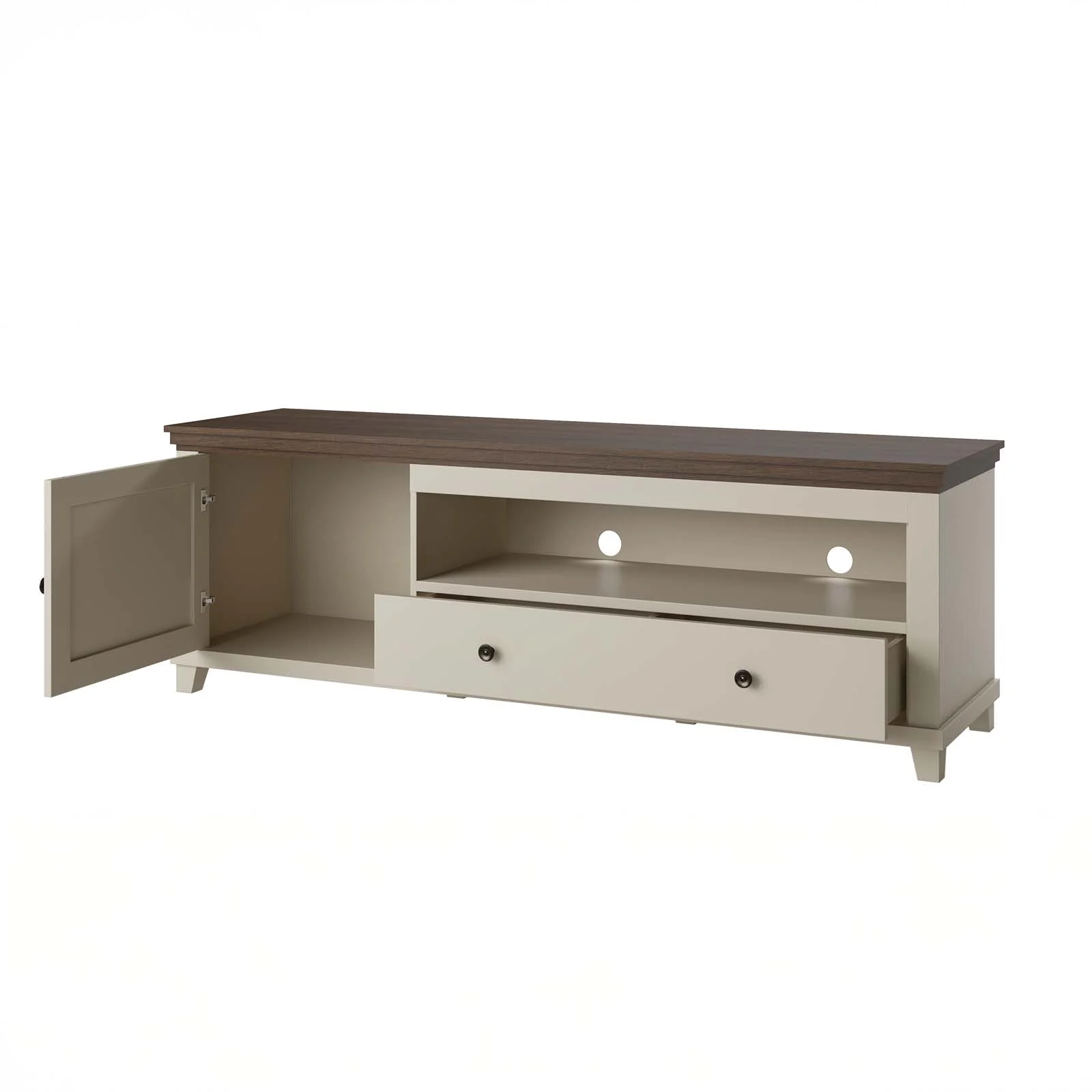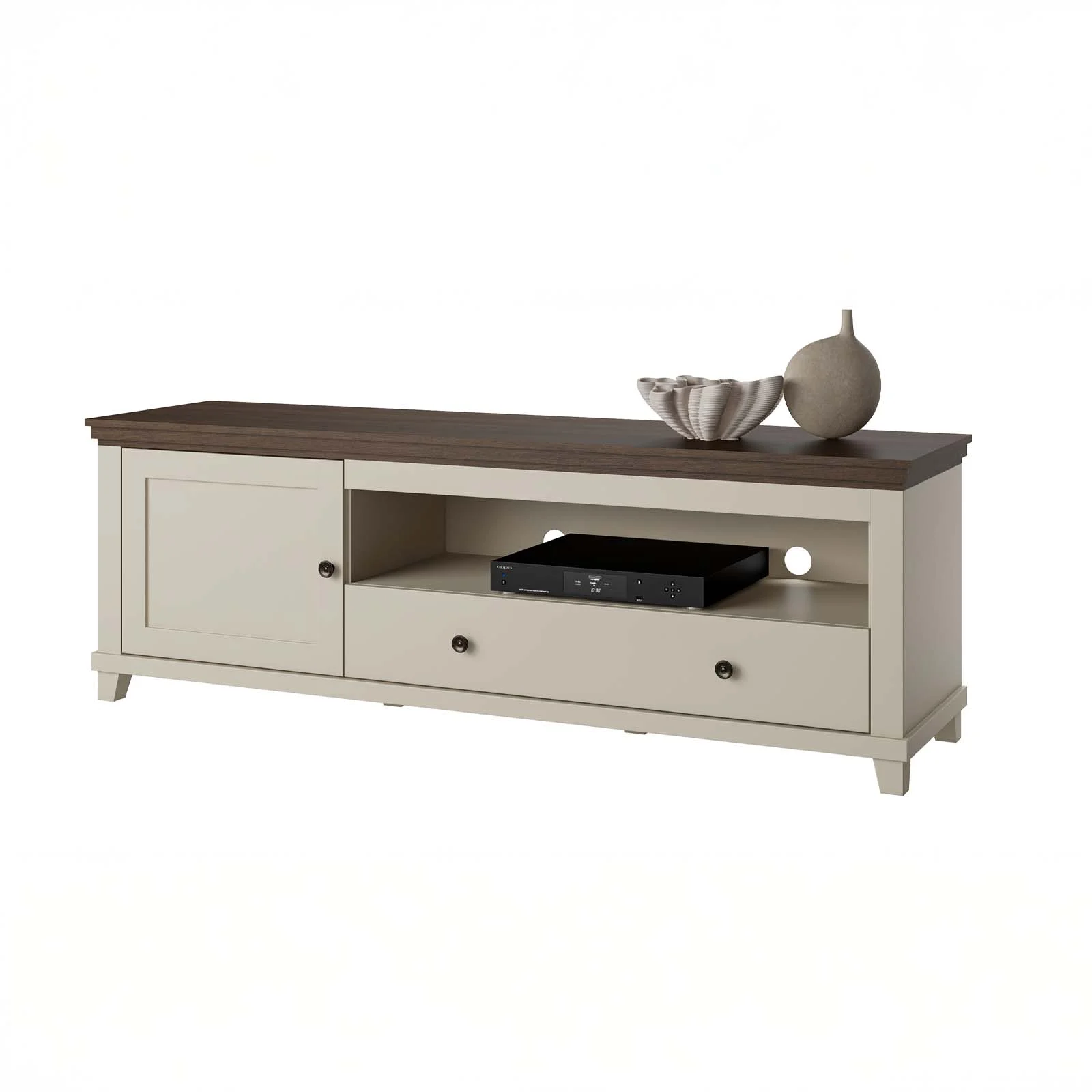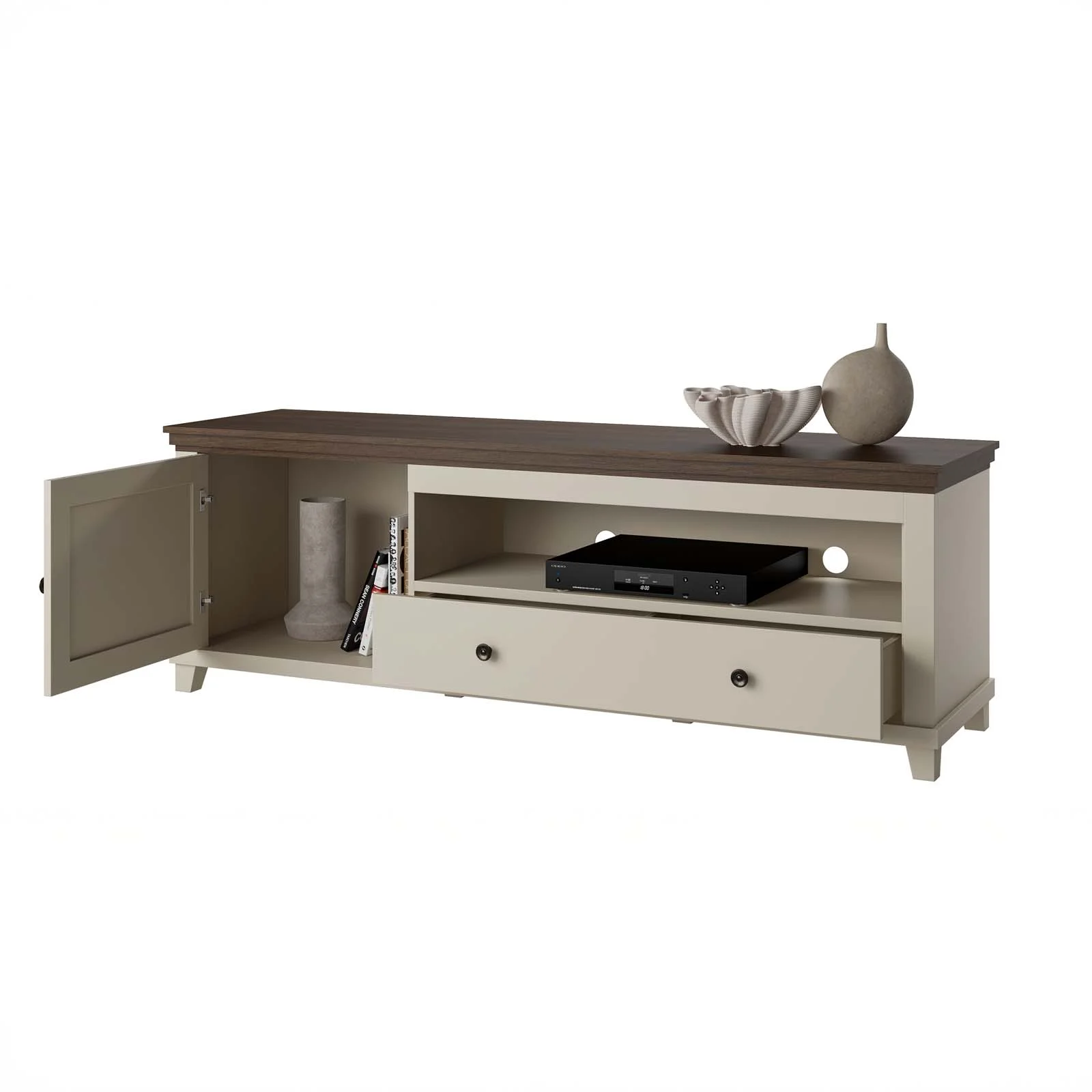 La struttura comprende 1 anta battente, 1 cassetto scorrevole e 1 vano a giorno con fori passacavi, ideale per dispositivi multimediali come decoder, console o lettori. All’interno dell’anta si trova un pratico vano contenitore per mantenere in ordine accessori e oggetti di uso quotidiano.