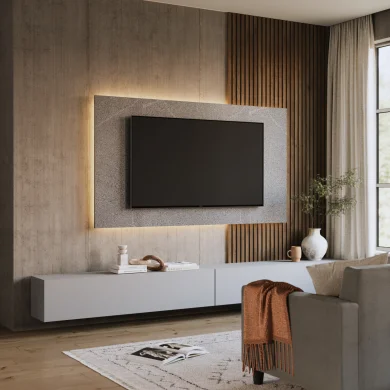 Il pannello porta TV Sunset effetto pietra è la soluzione ideale per completare il soggiorno con stile ed eleganza. Con le sue dimensioni di 180x100 cm e uno spessore di 2 cm, offre un supporto sicuro e raffinato per l’installazione della TV, grazie al foro centrale dedicato.