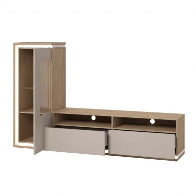 Il design lineare è arricchito da una vetrina con inserti in vetro, che mette in risalto oggetti e decorazioni grazie all’illuminazione LED inclusa, creando un’atmosfera raffinata e accogliente. La praticità è assicurata dai dettagli studiati con cura, come i fori passacavi integrati nel mobile TV, che permettono di mantenere ordine ed estetica impeccabile.