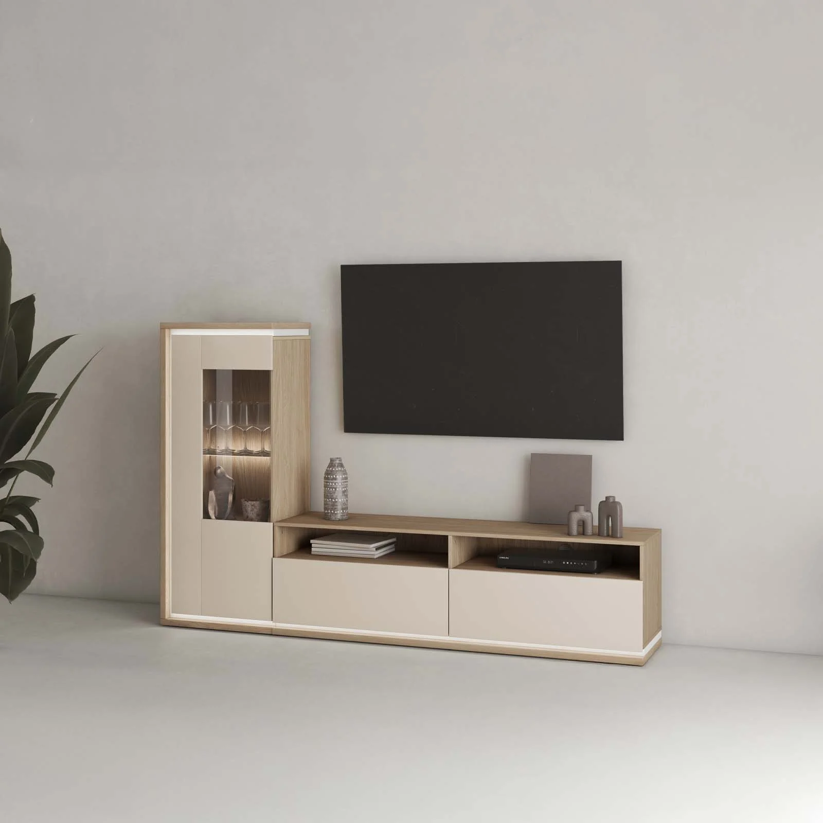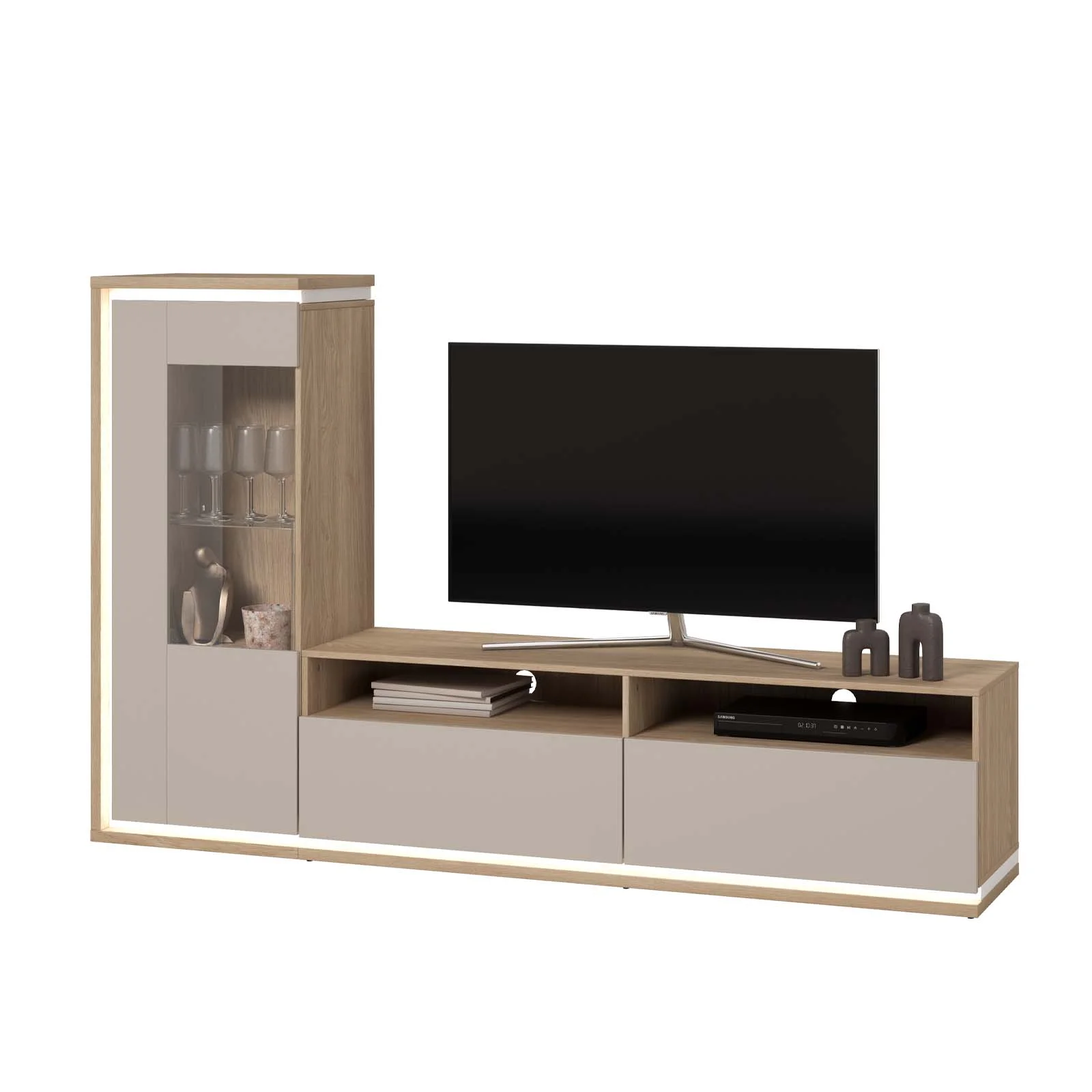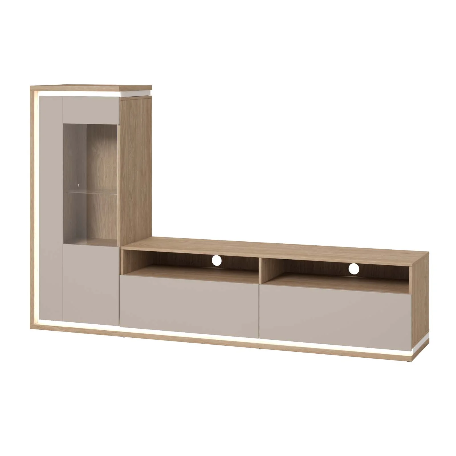 Parete attrezzata 215x135h cm con vetrinetta e mobile TV con led beige rovere Lyve La parete attrezzata della nuova collezione Lyve è il perfetto equilibrio tra modernità, eleganza e funzionalità.... continua a leggere