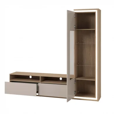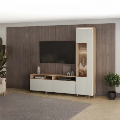Il design lineare è arricchito da una vetrina con inserti in vetro, che mette in risalto oggetti e decorazioni grazie all’illuminazione LED inclusa, creando un’atmosfera raffinata e accogliente. La praticità è assicurata dai dettagli studiati con cura, come i fori passacavi integrati nel mobile TV, che permettono di mantenere ordine ed estetica impeccabile.