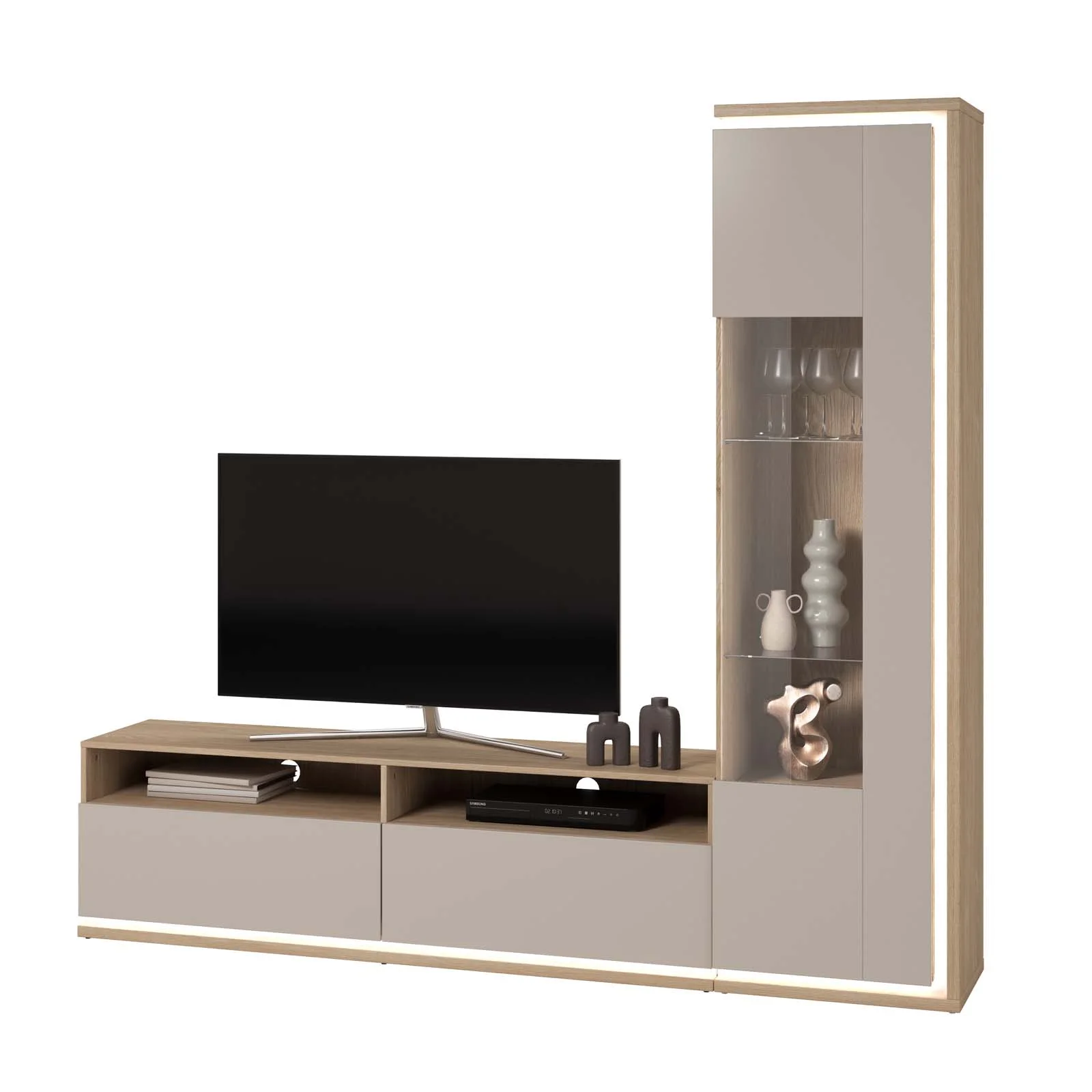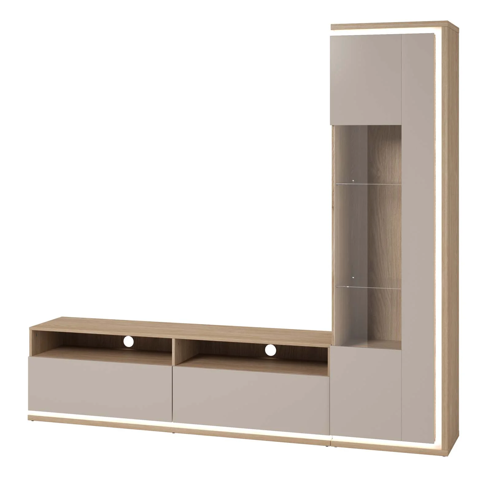 Parete attrezzata 215x201h cm con vetrinetta a colonna e mobile TV con led beige rovere Lyve La parete attrezzata della nuova collezione Lyve è il perfetto equilibrio tra modernità, eleganza e... continua a leggere