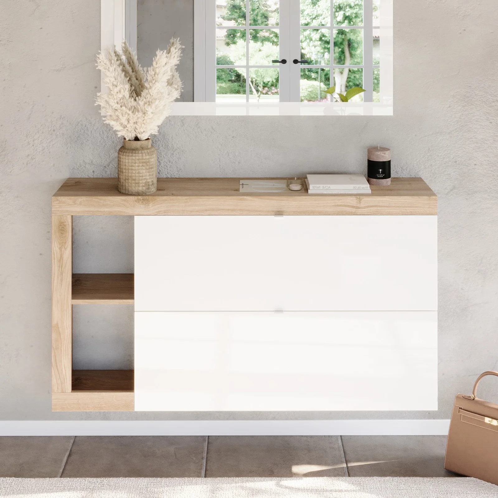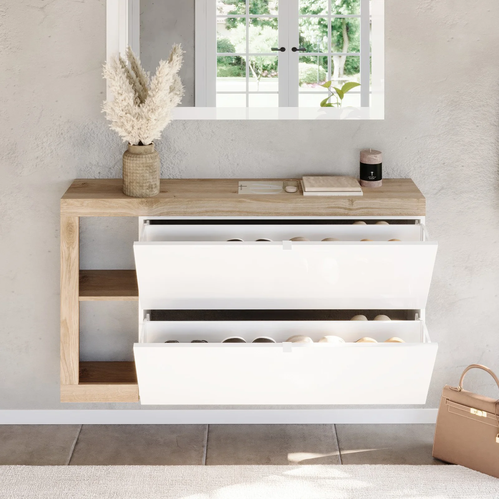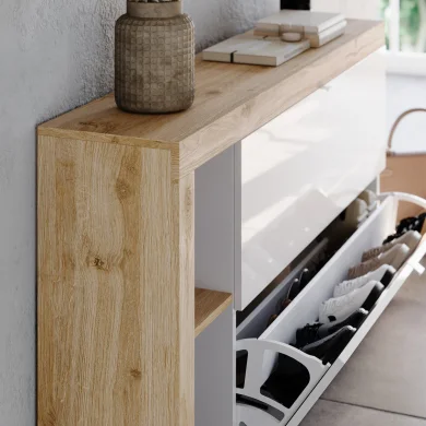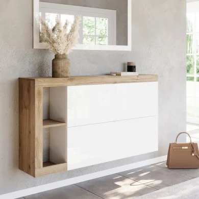 Scopri la scarpiera sospesa con ante a ribalta e porta nella tua casa eleganza e organizzazione in un solo gesto.